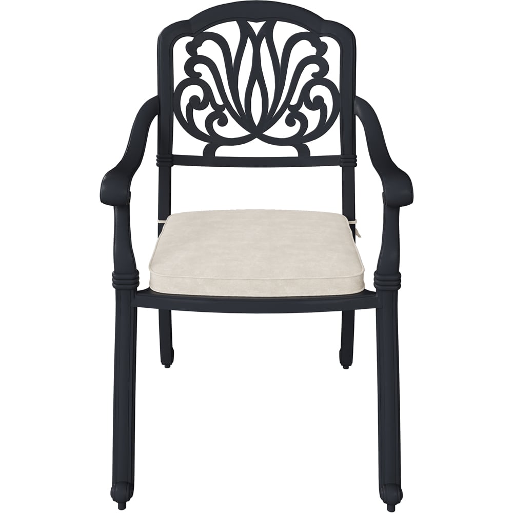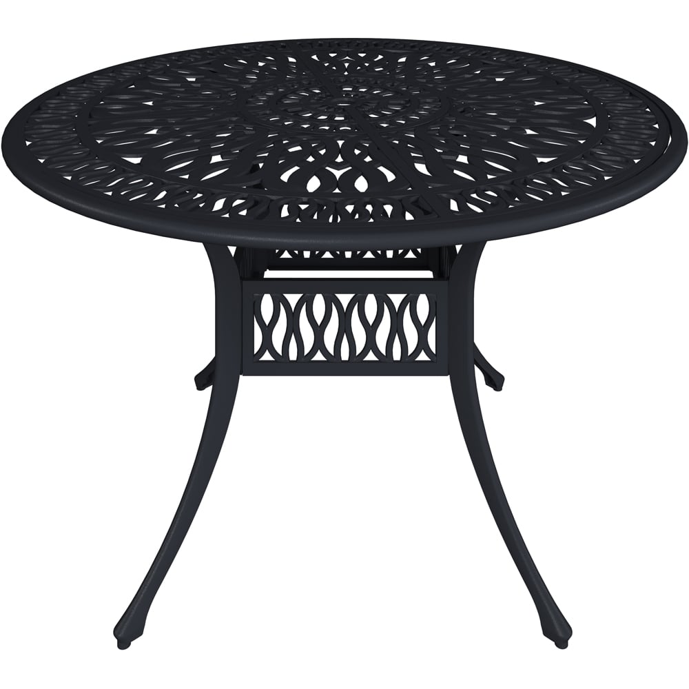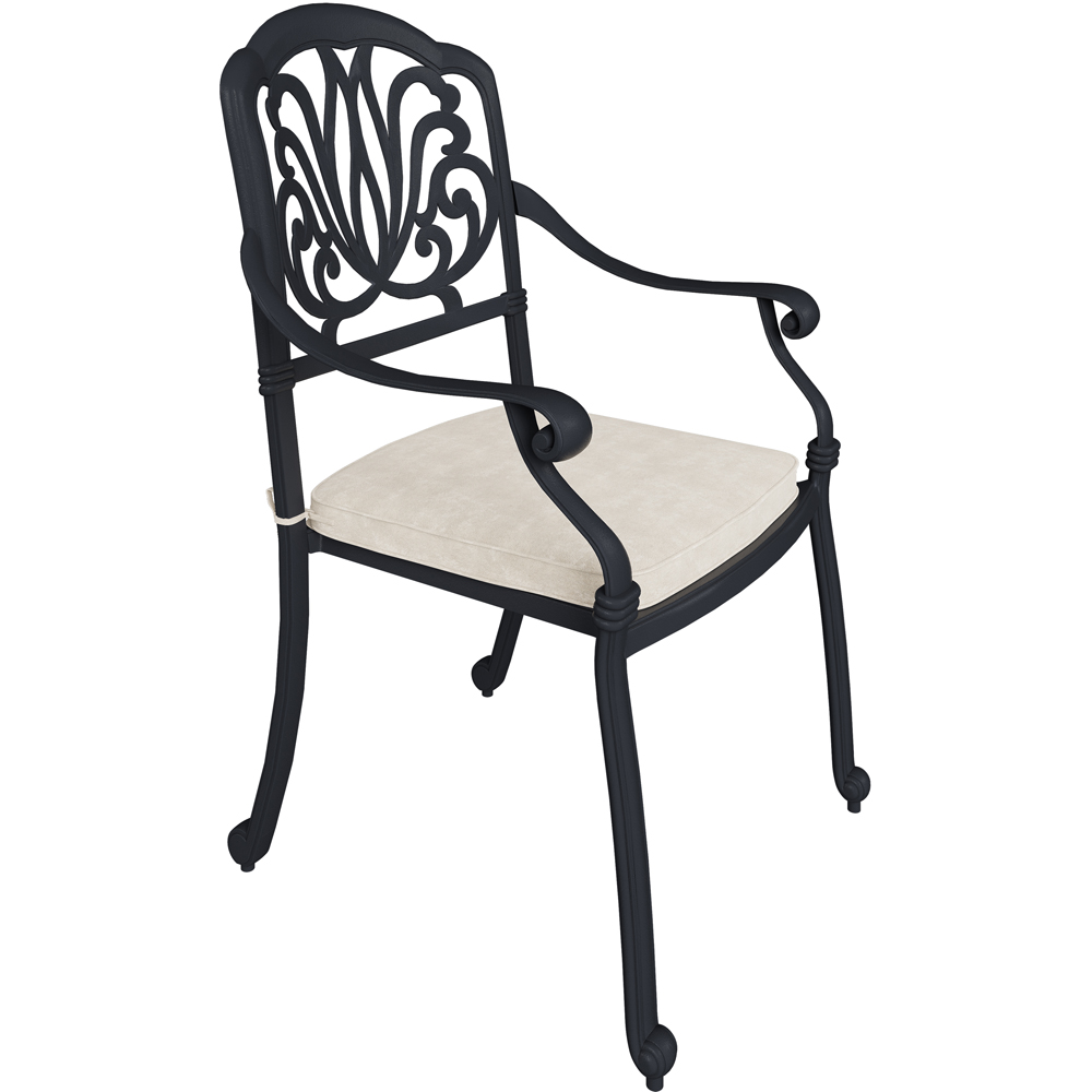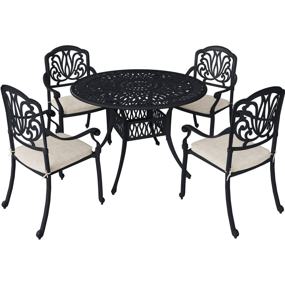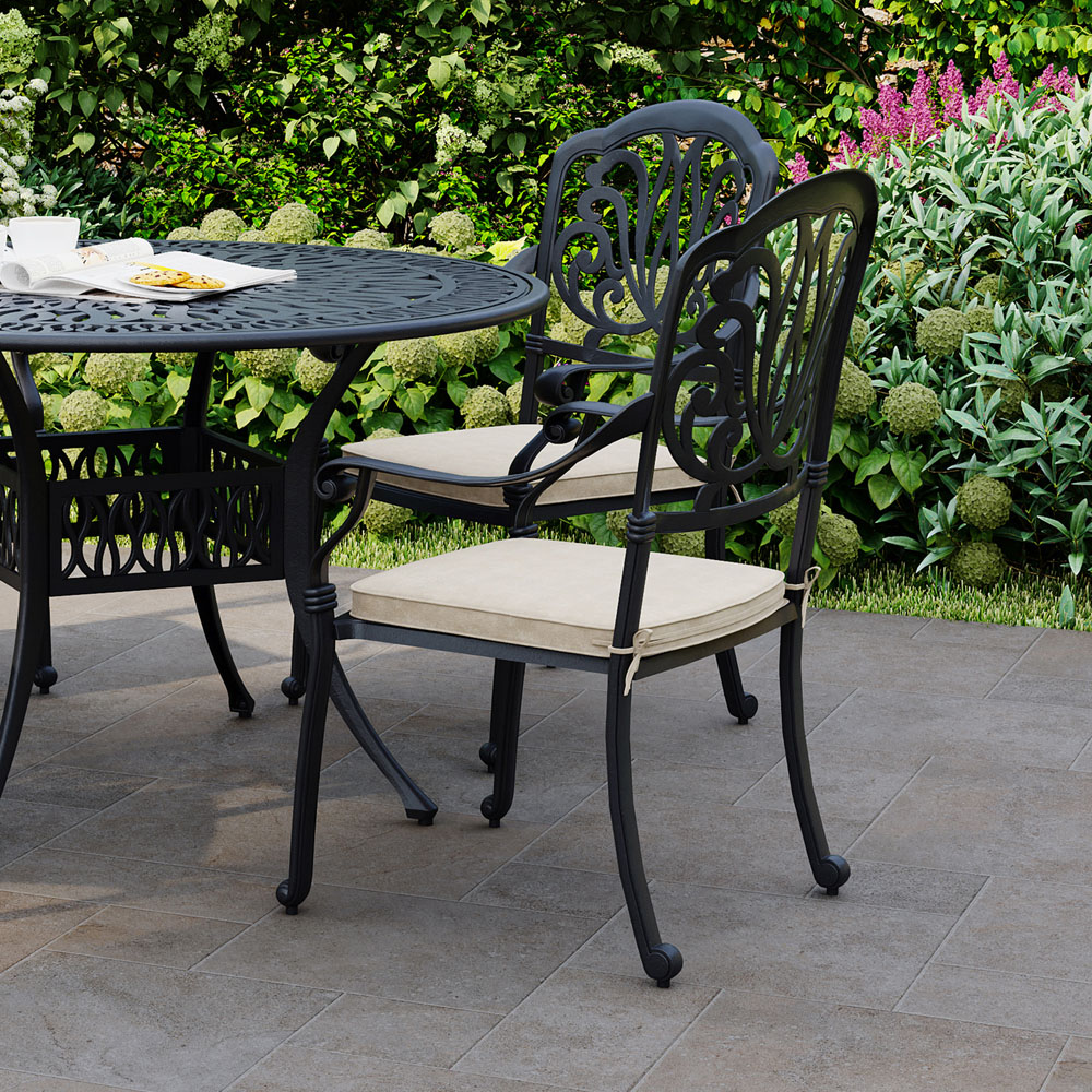 This Charles Bentley premium 4 seater round garden furniture set is ideal for dining and entertaining outdoors. It's made from high quality cast aluminium and has a classic matt black finish. The outdoor dining set has an elegant design which features a filigree style pattern on both the table and chairs. It includes a round table, four arm chairs and four thick beige cushions for extra comfort. The cushion seat pads are fully removable and have a thickness of 5cm. This garden dining set has soft flowing lines making it an attractive choice for your garden or patio. Dimensions: Table – Dia. 120 x H73cm. Chair – H90 x W52 x D55cm. Cushions - W48 x D49cm Diameter - 48mm. Protect your garden furniture with our durable and waterproof covers. Explore our wide range of heavy-duty Garden Furniture covers to find the perfect fit for your needs.