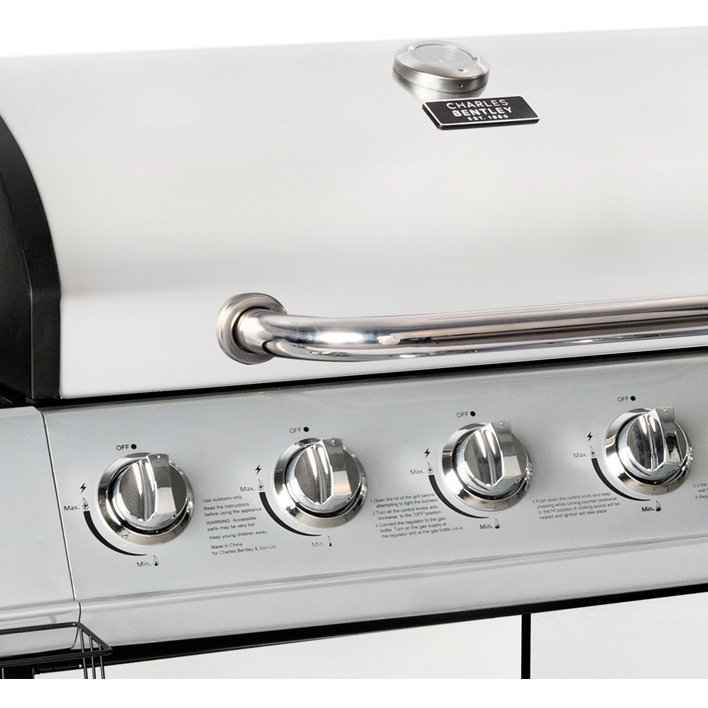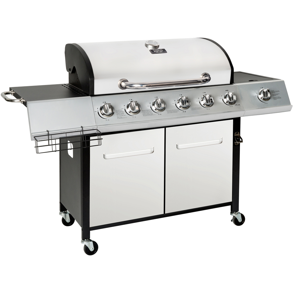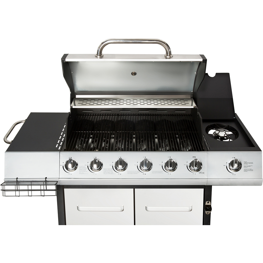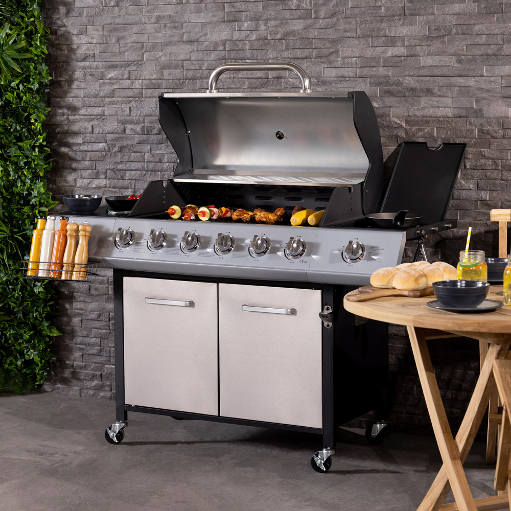 Perfect for accommodating large family feasts, this highly versatile and powerful premium gas barbecue is ideal for any sized garden. The 6 x individually ignitable gas burners mean that you can create a variety of temperature zones across the grill and cook a wide range of foods, all at the same time. Featuring a large cooking area, there's also an additional side burner which can be easily ignited and controlled. Set with a full-length warming rack, there's also a handy thermometer in the hood, to easily monitor cooking temperature. The double-layered hood provides added insulation and can keep food warm for up to 30 minutes after the barbecue has been turned off. For added convenience, there's a side table for food preparation and a removable drip tray for easy cleaning. Complete with additional storage space, there's a lower double storage cupboard, three utensil hooks and even a sauce rack for your favourite sauces. Finished with four castor wheels, side handle and brakes, the gas barbecue can be easily manoeuvred around the garden or patio. Designed with a heat and flame resistant paint, this high-quality barbecue will last for many years to come and ie easy to store away when not in use. Specifications: IGT Brand UK standard CE approved regulator with 0.8m hose. 24.3Kw Total Power. Power: 3.6kW per main burner (6). Power 2.7kw per side burner (1). Dimensions: H110 x L152.5 x D58cm. Large cooking area: 83 x 45cm. Includes: 1 x Fixed bottle opener, 4 x Castor wheels with brakes for easy manoeuvring, 1 x Side Table, 1 x Removable grease tray, Stainless steel front doors with bottom shelf perfect for storage, 3 x Utensil hooks, 2 x Steel wiring cooking grids, 1 x Thermometer and 1 x Stainless Steel warming rack. Keep your BBQ covered and protected with our range of premium