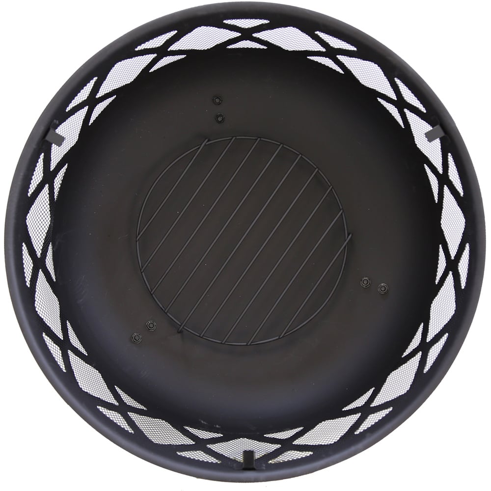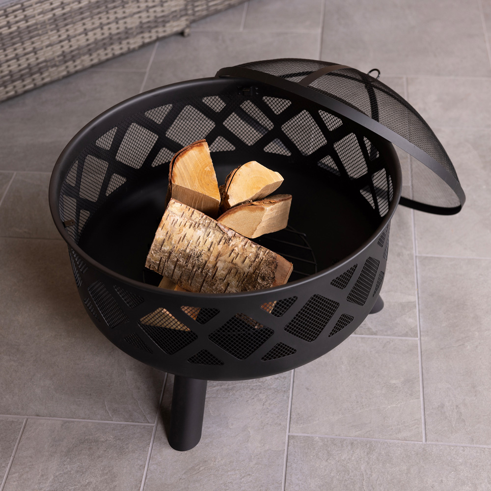 Crafted in a stylish round shape with three sturdy metal legs, this Charles Bentley modern black fire pit features a timeless lattice design around the edge. Perfect for adding extra warmth and light when you want to stay sitting outside on those crisper nights, this fire pit is a practical garden accessory. Suitable for burning both wood and charcoal, this fire pit comes with a safety poker and mesh cover, preventing debris from escaping. A log grate is also included. With a heatproof painted finish, this fire pit can withstand very high temperatures. Constructed from durable steel, it will last for many years to come. Approx size: H58 x W61 x L61cm