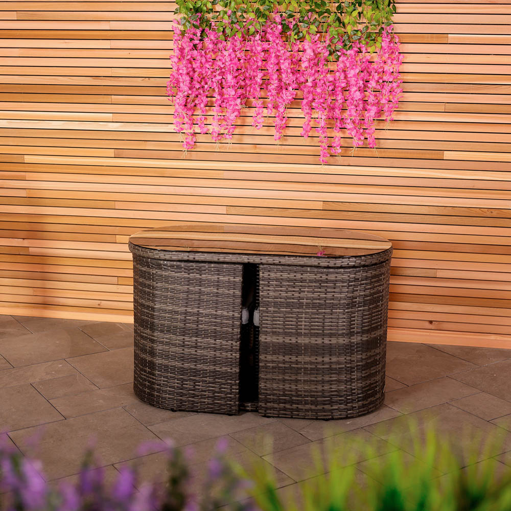 Excellent addition to any outdoor space, Charles Bentley St Tropez rattan set comes in a modern grey rattan weave complimenting any garden, patio, decking or balcony area. Built for two, this is great for couples with a small garden or limited space that want the luxury of a rattan set while keeping a compact dining set. The space-saving design allows you to maximise garden space when the set isn't in use. Two comfortable chairs effortlessly store away under the table and pull out to reveal a spacious set. Whether you enjoy a morning coffee in the sun or dining al fresco in the summer months, this is sure to get lots of use. Perfect for relaxing in your garden with your partner. Size- chair H67 x W53 x D57cm, table: H72 x W118 x D57cm. Protect your garden furniture with our durable and waterproof covers. Explore our wide range of heavy-duty Garden Furniture covers to find the perfect fit for your needs.