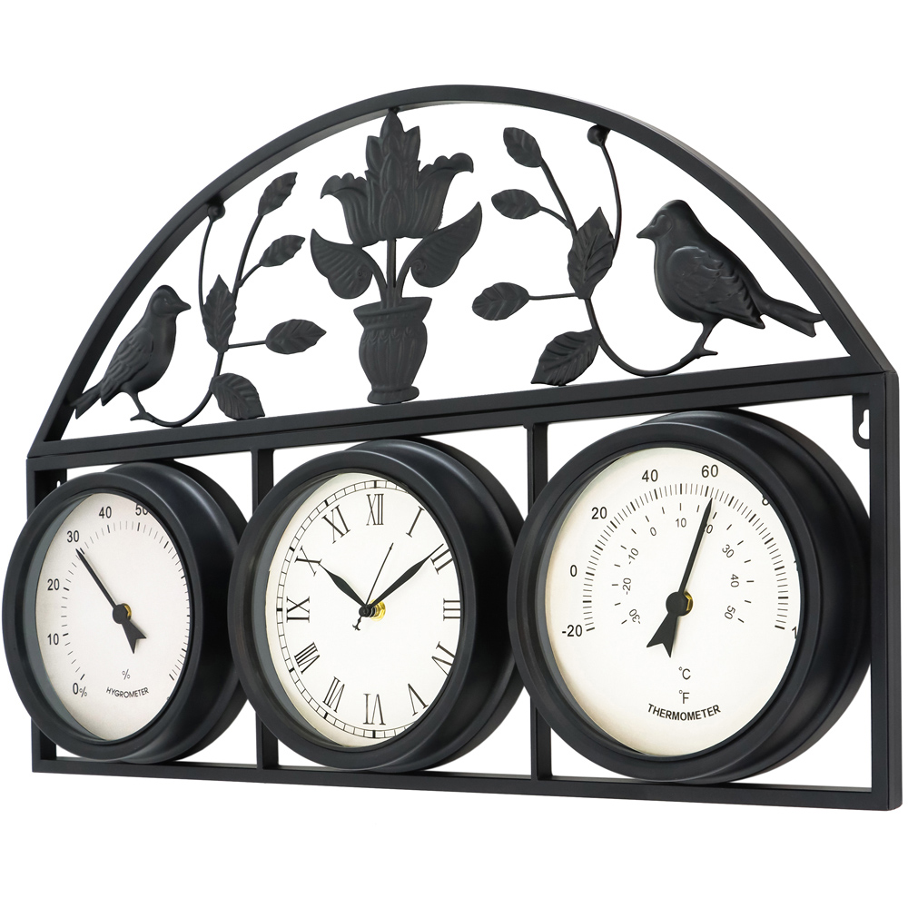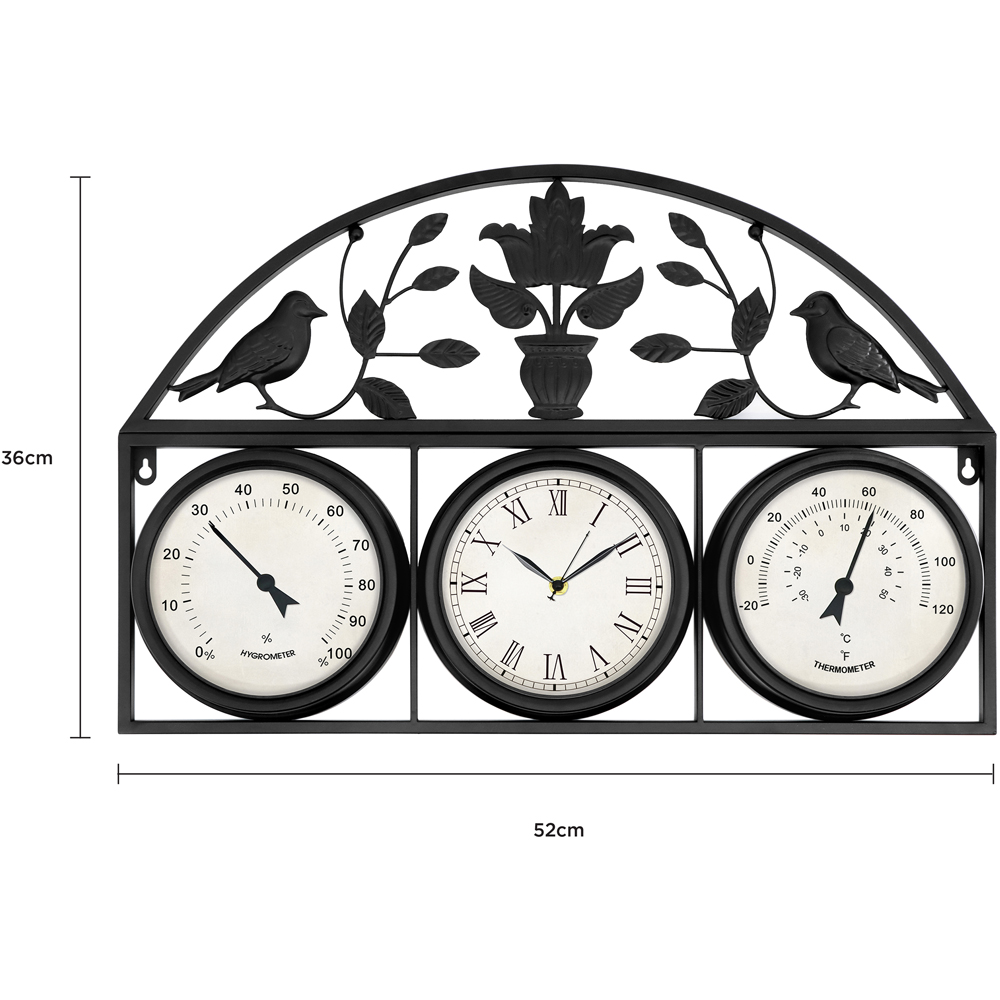 This Charles Bentley gorgeous garden wall clock has a shabby chic distressed dark grey finish, and features 3 faces displaying a clock, thermometer and hygrometer. This vintage wall clock is the perfect accessory for any garden. Please note: Item comes with screws and wall fittings. Overall: L52 x W5 x H36cm. Clock face: Dia. 15cm