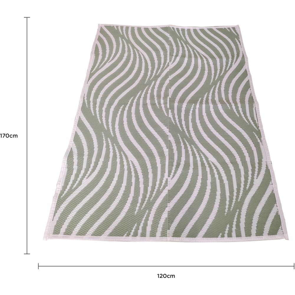 Adopt the essence of outdoor comfort with the Charles Bentley Green Wave Outdoor Rug 120 x 170cm. Its wave design creates a fashionable focal point for your outdoor living areas like gardens and patios. This rug is not only ideal for outdoor spaces but also works well around the house, in hallways, kitchens, and conservatories, making it a versatile choice for any part of your home. Made from 50% recycled weatherproof material, this rug is easy to clean with a sponge and is UV resistant. Please note that the rug will arrive folded and can be slippery when wet. It is recommended that the rug be stored indoors during the winter months to maintain its quality.