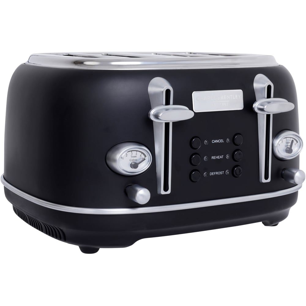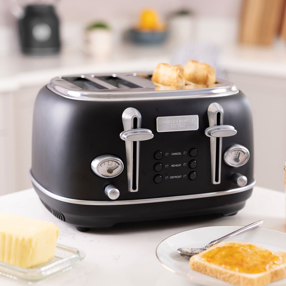 Add a touch of style to your kitchen with this matching matt kettle and toaster set finished with sleek silver coloured accents. Designed with both practicality and style in mind, the 1.7L kettle boasts a rapid boil function, a classic thermostat dial, and a clear water window for easy monitoring. Its 360° swivel base, automatic shut off, and soft touch handle ensure safety and effortless comfort every time. Its large capacity can make up to seven cups at a time. The matching four-slice toaster perfectly complements the kettle, featuring dual browning controls, defrost and reheat functions, plus a convenient cancel button for complete control. LED indicators add a modern touch, while the removable crumb trays and built-in cord storage keep your kitchen tidy and organised.