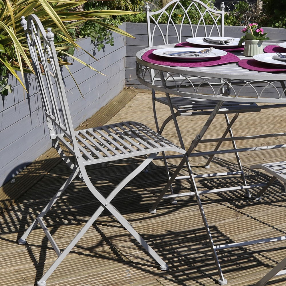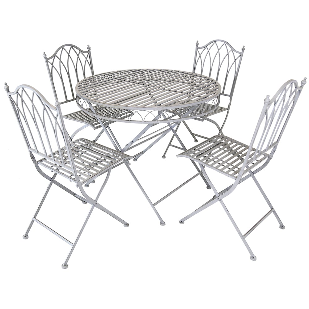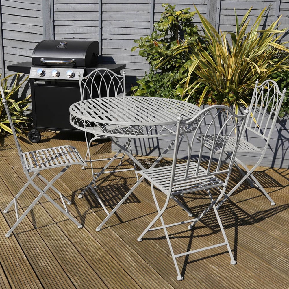 Enjoy your outdoor area with friends and families with Charles Bentley 5 Piece Wrought Iron Bistro Set Grey. Lightweight and easy to move and store - this four-seater bistro or dining set has fully foldable chairs for added comfort. Perfect for your garden, patio or deck - this elegant set is sure to have every guest asking you about them. This 5 piece set includes foldable chairs and a table. Dimensions: Chair: H93 x D53cm x W43cm, Table: H74 x Dia.30cm. Protect your garden furniture with our durable and waterproof covers. Explore our wide range of heavy-duty Garden Furniture covers to find the perfect fit for your needs.
