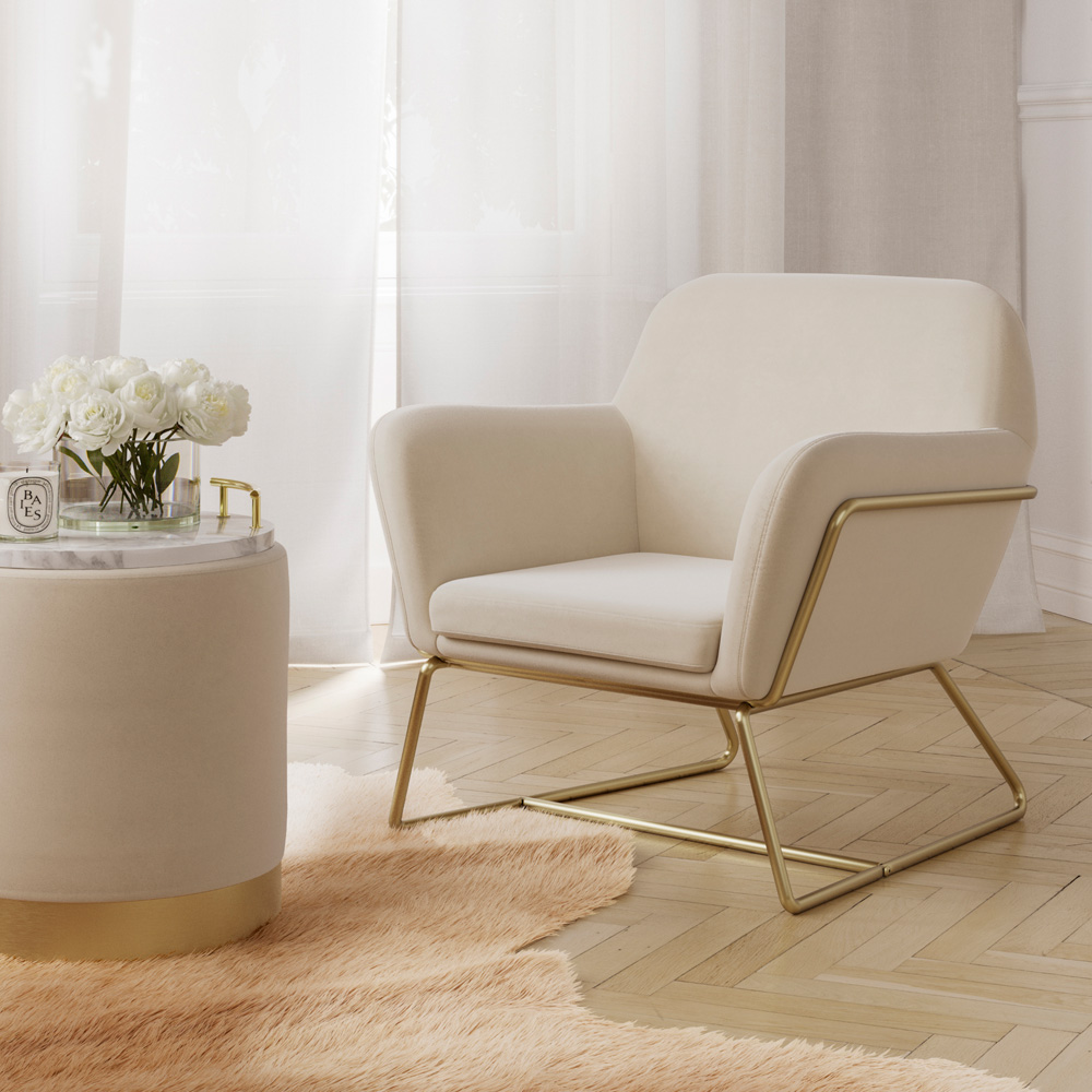 Make a style statement at your place with the Charles Brushed Gold and Cream Velvet Armchair. It features clean lines and elevates your space with both sophistication and comfort. Airy, refined and inviting, offering the perfect spot to relax in style.