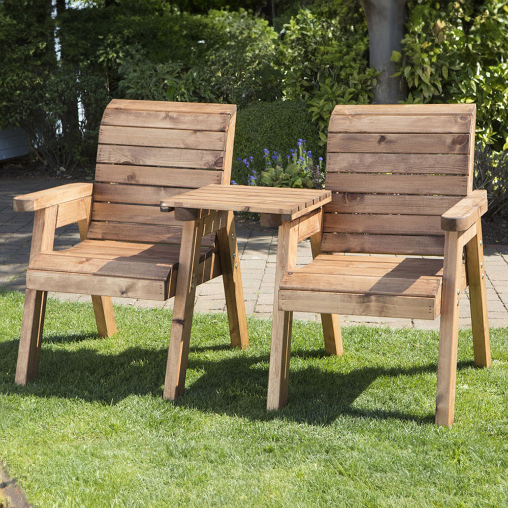 Create an outdoor retreat for relaxation and rejuvenation with the Charles Taylor 2 Seater Straight Boxed Companion Set. This set in a classic English design comprises two armchairs with a removable straight centre tray. Hand-finished and made using sustainably sourced (FSC) wood, the wood has been treated with an oil-based water-repellent preservative and rustproof galvanised zinc bolting to ensure that the bolts are protected against corrosion and rusting. Each chair has a weight limit of 130kg, an internal arm width of 510mm and the seat height from the ground is 460mm. The set comes with a 10-year rot-free guarantee. Accessories shown in the image are for display purposes only. Protect your garden furniture with our durable and waterproof covers. Explore our wide range of heavy-duty Garden Furniture covers to find the perfect fit for your needs.