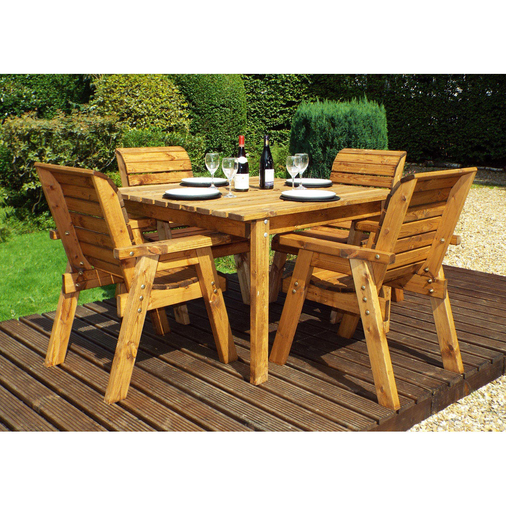 Add practicality to your garden area with this solid wood outdoor four-seater square dining set with green cushions by Charles Taylor. This product is made in Britain (UK) and is hand-finished using sustainably sourced (FSC) wood. The wood has been treated with an oil-based, water-repellent preservative and rustproof galvanised zinc bolting to protect the bolts against corrosion and rusting. This set features four matching armchairs with square dining table for a convenient yet stylish experience. Chair dimensions - weight limit is 130kg, internal arm width is 510mm, and the seat height from the ground is 460mm. Also, it is delivered using a white glove delivery service, so it will be dropped off wherever you want it in your garden, with all packaging removed. Included is a 10-year rot-free guarantee and accessories shown in the image are for display purposes only. Protect your garden furniture with our durable and waterproof covers. Explore our wide range of heavy-duty Garden Furniture covers to find the perfect fit for your needs.