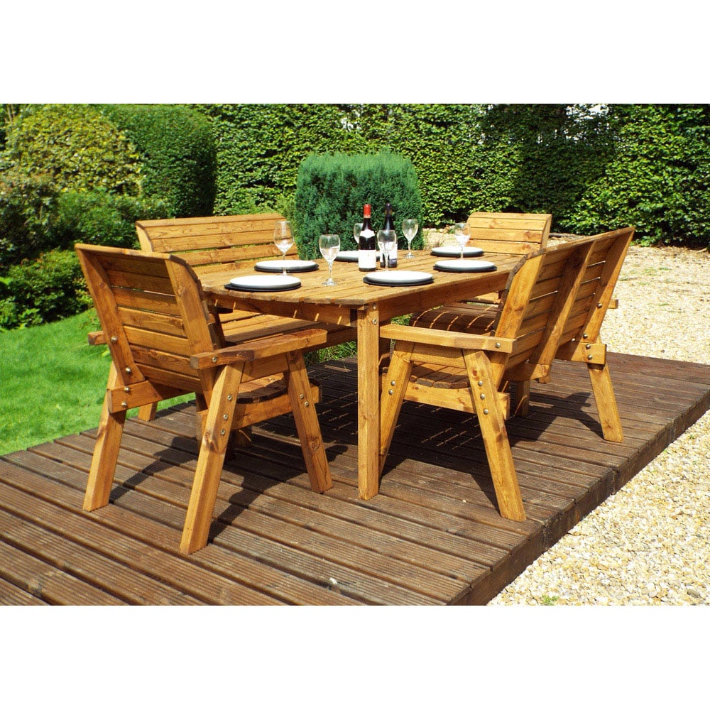 Add practicality to your garden area with this solid wood outdoor six-seater rectangular dining set with green cushions by Charles Taylor. This product is made in Britain (UK) and is hand-finished using sustainably sourced (FSC) wood. The wood has been treated with an oil-based, water-repellent preservative. This set features two matching armchairs, two matching two-seater benches and a rectangular dining table for a convenient yet stylish experience. Set dimensions: H98 x W290 x D245cm, weight limit per chair is 130kg, seat height from ground 46cm, chair internal arm width 51cm. Included is a 10-year rot-free guarantee and accessories shown in the image are for display purposes only. Protect your garden furniture with our durable and waterproof covers. Explore our wide range of heavy-duty Garden Furniture covers to find the perfect fit for your needs.