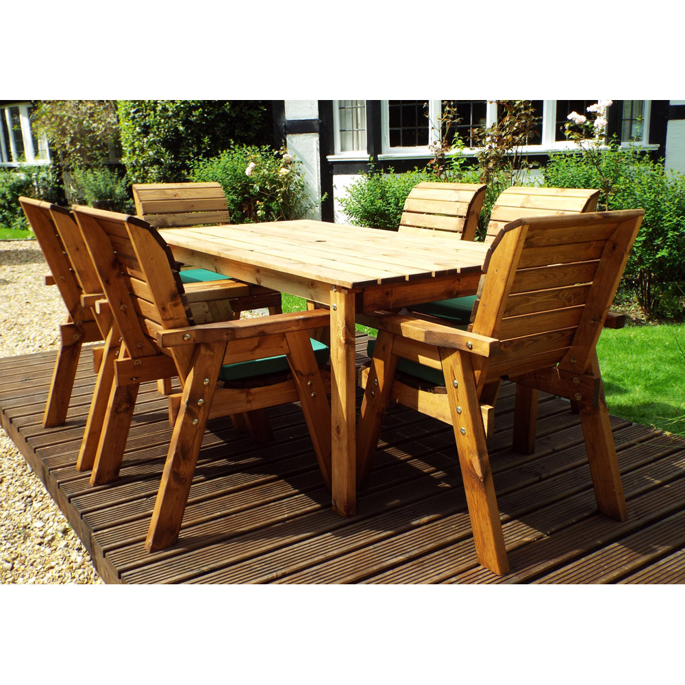 Add practicality to your garden area with this solid wood outdoor six-seater rectangular dining set with green cushions by Charles Taylor. This product is made in Britain (UK) and is hand-finished using sustainably sourced (FSC) wood. The wood has been treated with an oil-based, water-repellent preservative. This set features six matching armchairs with rectangular dining table for a convenient yet stylish experience. Set dimensions: H98 x W290 x D245cm, weight limit per chair is 130kg, seat height from ground 46cm, chair internal arm width 51cm. Included is a 10-year rot-free guarantee and accessories shown in the image are for display purposes only. Protect your garden furniture with our durable and waterproof covers. Explore our wide range of heavy-duty Garden Furniture covers to find the perfect fit for your needs.