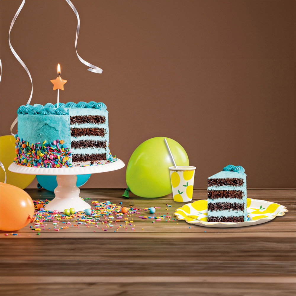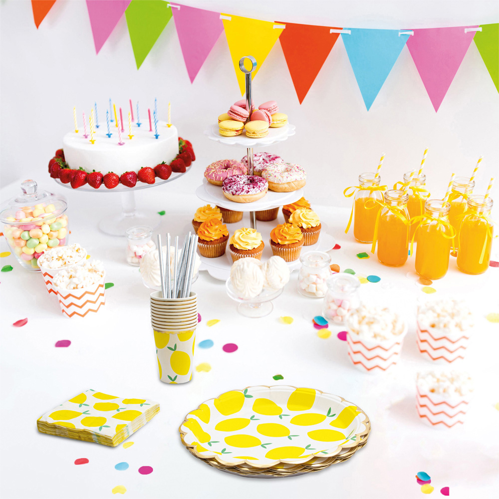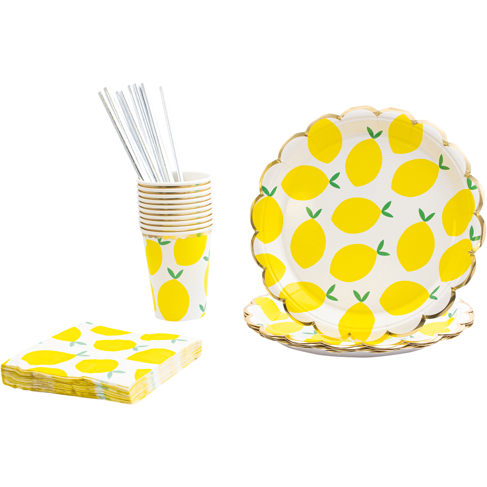 Upgrade your dining décor with the Cheetah Lemon Party Tableware Set 40 Piece. This convenient 40-piece set is ideal for children's parties, picnics and family gatherings. This set includes 10 large plates (23cm diameter), 10 cups (9.5cm height), 10 napkins and 10 straws (19.5cm length) – all perfectly matching to create a coordinated look for your party. Designed for convenience, this tableware set makes cleanup a breeze. Simply dispose of or recycle the items after use, saving your time and effort. With an eye-catching lemon design, you can add a bright touch of energy to any occasion.