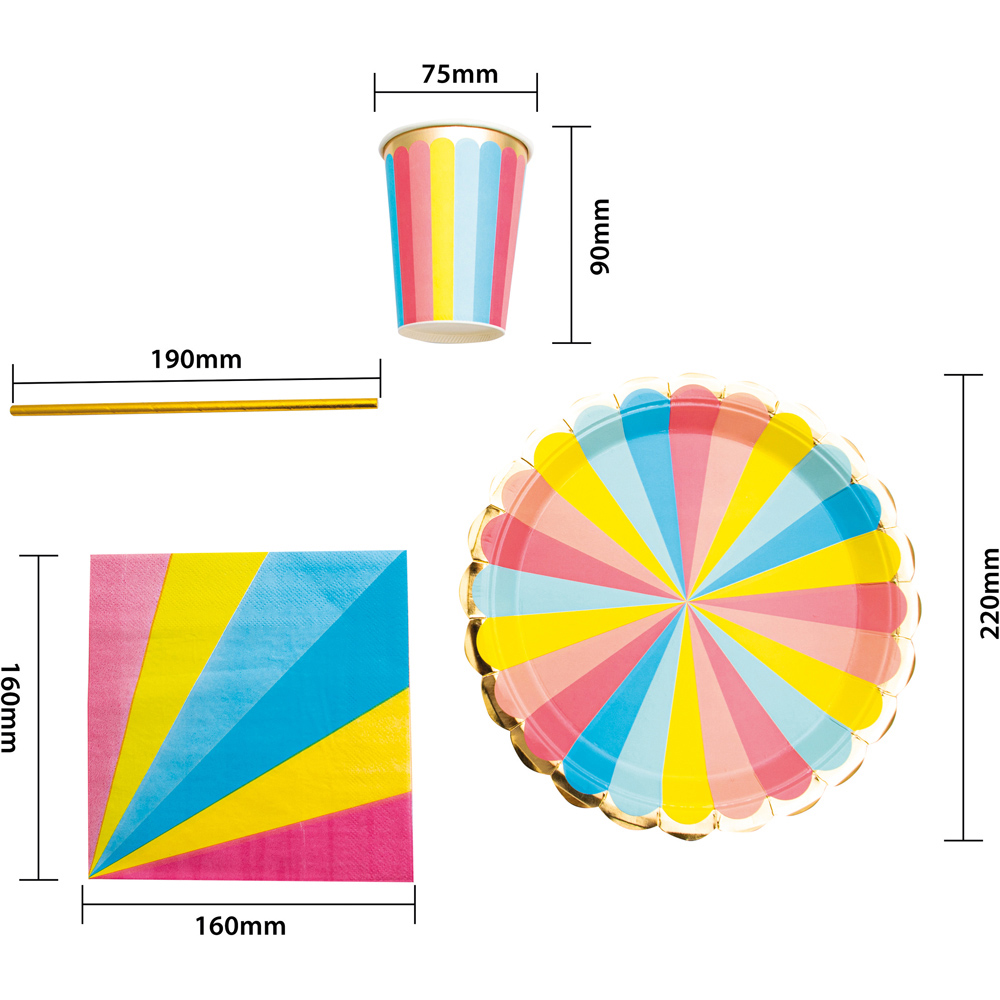 Upgrade your dining décor with the Cheetah Rainbow Party Tableware Set 40 Piece. This convenient 40-piece set is ideal for children's parties, picnics and family gatherings. This set includes 10 large plates (23cm diameter), 10 cups (9.5cm height), 10 napkins and 10 straws (19.5cm length) – all perfectly matching to create a coordinated look for your party. Designed for convenience, this tableware set makes cleanup a breeze. Simply dispose of or recycle the items after use, saving your time and effort. With an eye-catching rainbow design, you can add a splash of colours to any occasion.