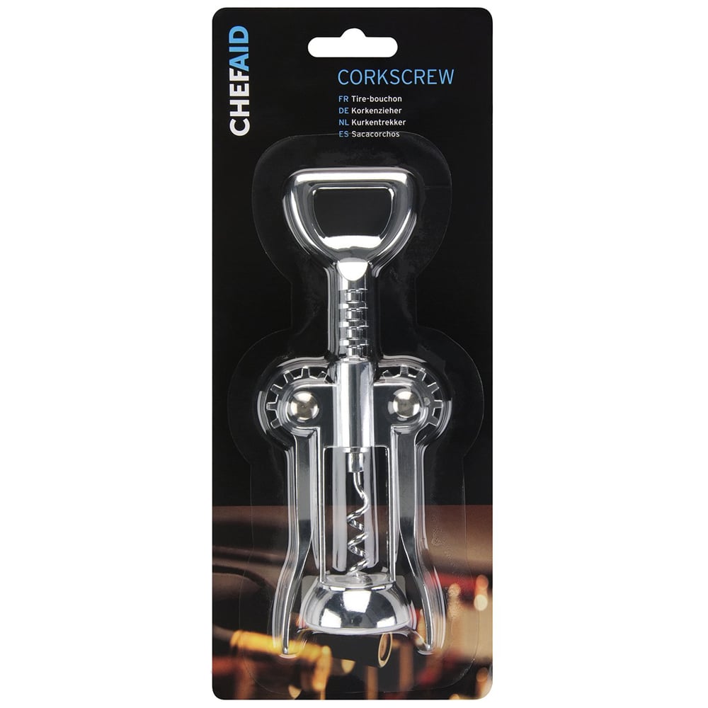Never get caught with a bottle of wine without a corkscrew thanks to the easy to use ChefAid Corkscrew! The perfect tool for any home, this corkscrew easily pulls the cork from wine bottles without damaging the bottle. Simply screw the top into the cork to raise the arms, then push the arms down to remove the cork!