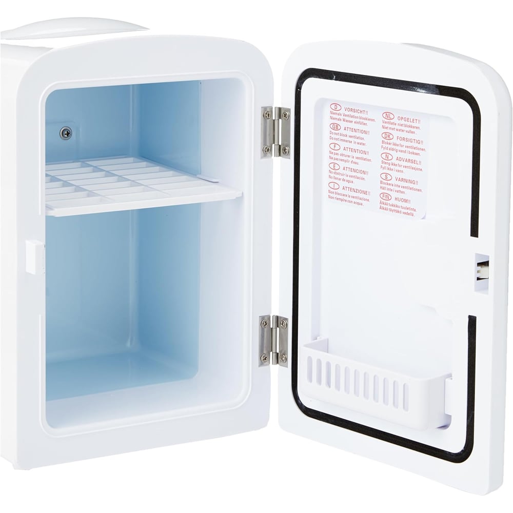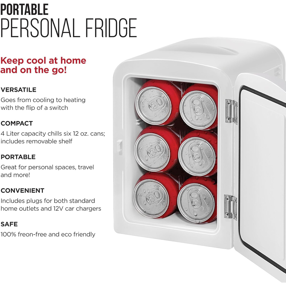Looking for a convenient and versatile mini fridge that is perfect for personal spaces, travel, offices, student halls, road trips, boating, camping, car picnics, and commuting? Look no further than the Chefman 26089RG White 4L Mini Fridge. The fridge is the ultimate solution for all your personal needs, whether you're at home or on the go. Its compact size and modern design make it the perfect companion for commuting, travel, offices, student halls, road trips, boating, camping, car picnics, and much more! You can store your snacks, drinks, soft drinks, baby bottles, skincare products, or even keep soup and hot meals warm by simply switching settings. With a four-litre capacity, it can chill up to six 350ml soft drink cans, and you can easily switch between heating and cooling by flipping a switch. The best part? It comes with plugs for both standard home outlets and car chargers, making it the most versatile mini-fridge on the market.