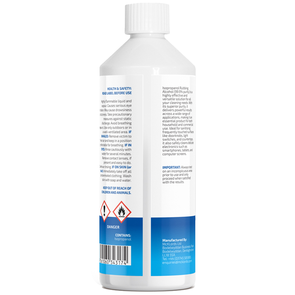 Isopropanol Rubbing Alcohol (99.9% purity) is a highly effective and versatile solution for all your cleaning, disinfecting, and degreasing needs. With its superior purity, it delivers powerful results across a wide range of applications, making it an essential product for both household and commercial use. Ideal for hygienically cleaning frequently touched surfaces like doorknobs, light switches, and countertops, it is also effective for cleaning delicate electronics such as smartphones, tablets, and computer screens, this is due to its fast-drying capabilities. This multipurpose rubbing alcohol effortlessly removes sticky residues and tough stains from various surfaces. The convenient 500ml bottle design ensures ease of use, providing an ample supply without taking up too much cupboard space. Whether for everyday cleaning or specialised tasks.