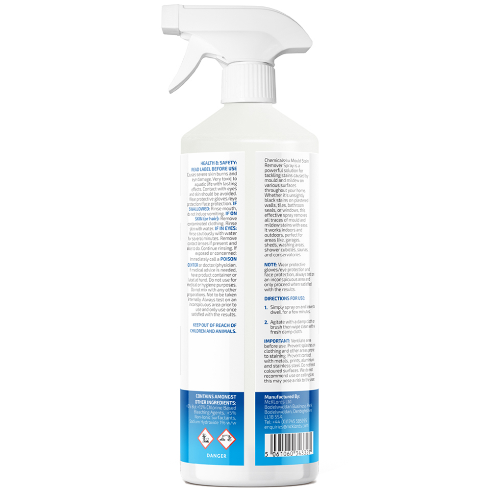 Chemicals4U Mould Stain Remover Spray is a powerful solution for tackling stains caused by mould on various surfaces throughout your home. Whether it's unsightly black stains on plastered walls, tiles, bathroom seals, or windows, this effective spray removes all traces of mould stains with ease. It works indoors and outdoors, perfect for areas like swimming pools, garages, sheds, washing areas, shower cubicles, saunas, and conservatories. Fast-acting and highly effective, Chemicals4U Mould Stain Remover Spray is your go-to solution for a cleaner, healthier home.