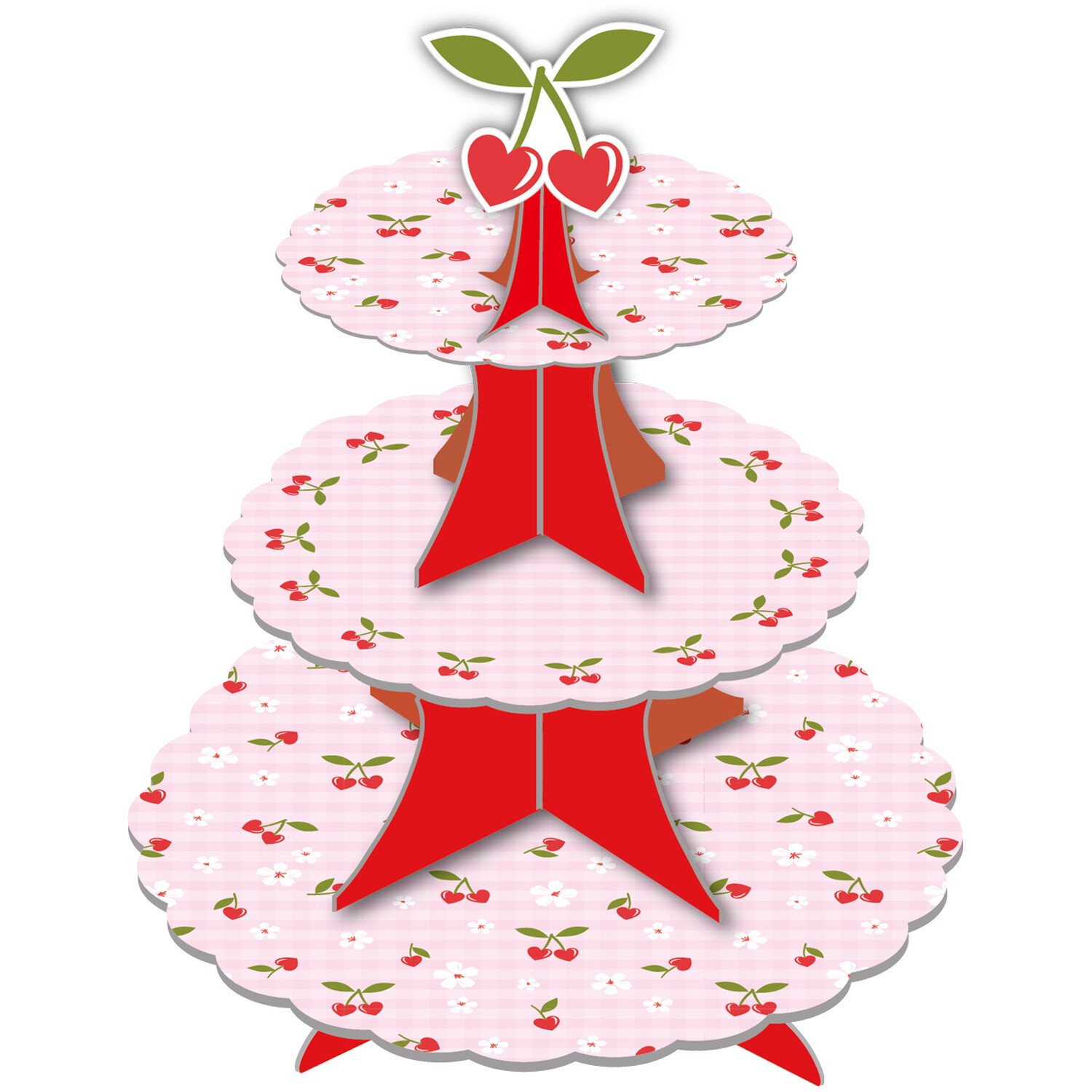 Add a cherry on top of your dessert display with this Cherry 3-Tier Cupcake Stand. This delightful stand features a charming cherry theme that’s sure to bring a smile to your face. Each tier showcases a lovely pattern of tiny cherries against a soft pink backdrop with floral accents, and those scalloped edges give it a fun touch. The red columns, designed to look like cherry stems, hold up the tiers, topped off with two cherries connected by their stems. Ideal for parties and get-togethers, this stand is not just practical but also a charming way to showcase your cupcakes.