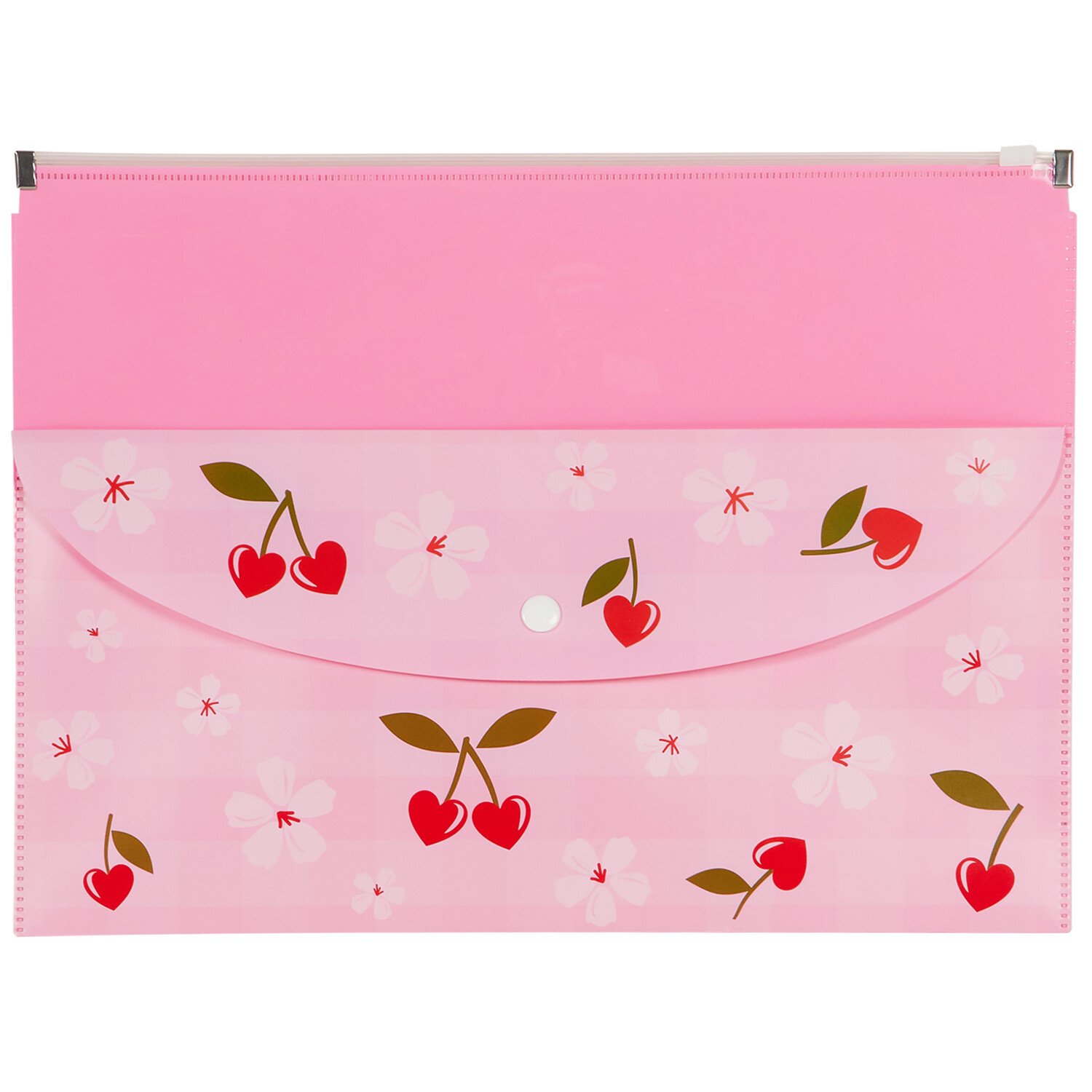Safe, secure, and stylish the Cherry Hearts A4 Zip Folder with Pocket is perfect for organising important papers and files neatly. It's adorned with a cute cherry heart pattern and brings a pop of colour to your daily routine. Featuring a front pocket for extra storage space, this zip folder is ideal for school, office and home use.