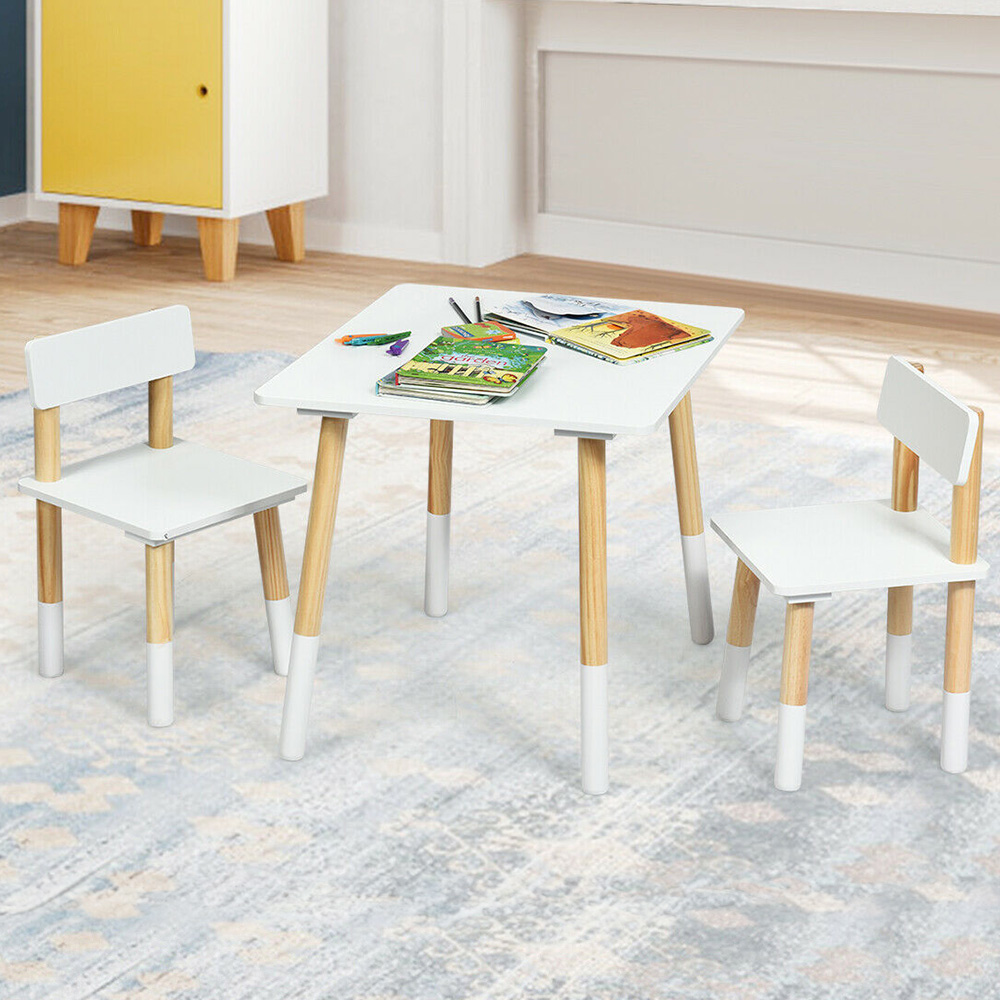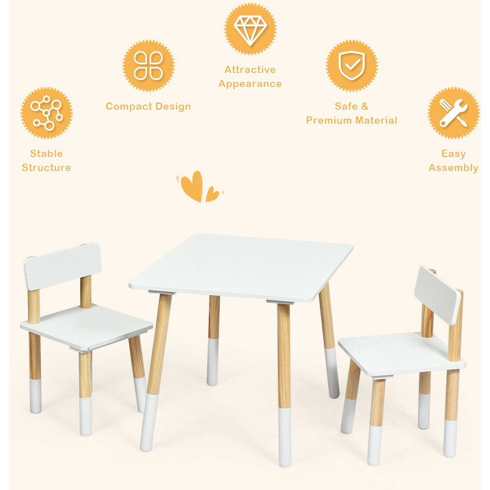 Upgrade your study area with the Costway 2 Seater White Children's Wooden Activity Table. Create a perfect space for your children to eat and play with this activity table and chair set. Made from pine and premium MDF, this set includes a rectangular table and two chairs, providing your children with their own space for eating, unleashing creativity, or relaxing. The white table and chairs with pine legs brighten up any room, and the rounded corners ensure safety. The legs have anti-slip footpads, and the set is light enough for children to move with little assistance, making it ideal for children's bedrooms, playrooms, or even outdoor use. This multifunctional set can be used as a dining table, activity table, or study table, meeting various needs. Kids can eat, read, draw, and play on this set, making it perfect for the living room, children's room, or playroom. Constructed with natural pine wood legs and an MDF board, the table and chairs are sturdy and durable, ensuring a long lifespan. The solid support legs provide good stability and a strong load-bearing capacity, while the smooth, burr-free surfaces protect your kids' skin. The child-friendly design includes rounded corners and non-slip foot pads to prevent floor scratches. The lightweight set allows children to move the table and chairs easily. This table and chairs set offers plenty of space for children to move freely and engage in imaginative and creative activities, making it an ideal gift for boys and girls aged 3-7. Assembly is easy with the provided instructions, and the smooth surface is simple to clean with a damp cloth.