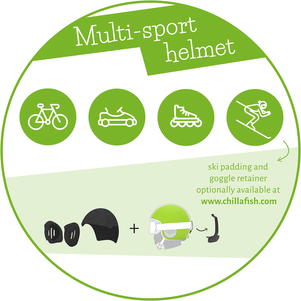 Chillafish Bobbi is a unique ABS hard-shell multi-sport helmet certified for cycling, skating and skiing, all in one. The hard shell features excellent toughness, protection and resistance to impact and has a low cut for maximum protection at the ears and neck. The back of the helmet is cut high enough for unobstructed head and neck movement, complete with ponytail hair ports ;-)
