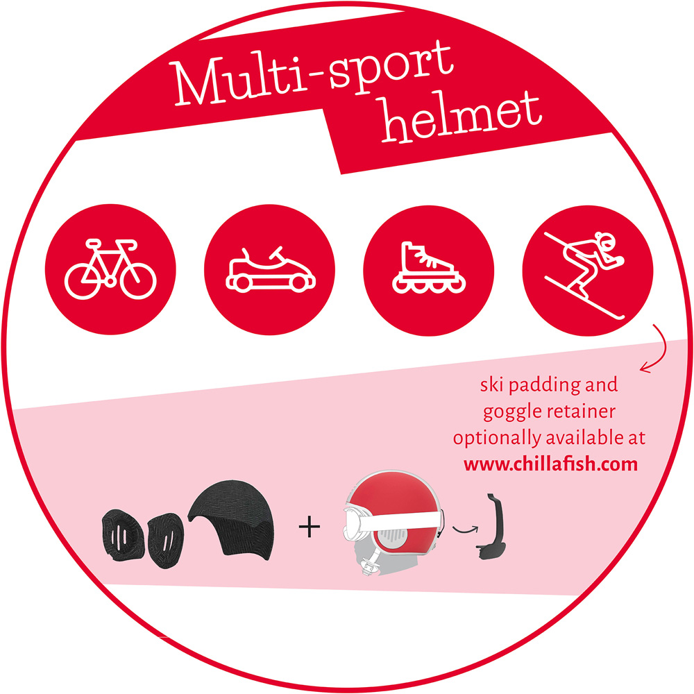 Chillafish Bobbi is a unique ABS hard-shell multi-sport helmet certified for cycling, skating and skiing, all in one. The hard shell features excellent toughness, protection and resistance to impact and has a low cut for maximum protection at the ears and neck. The back of the helmet is cut high enough for unobstructed head and neck movement, complete with ponytail hair ports ;-)