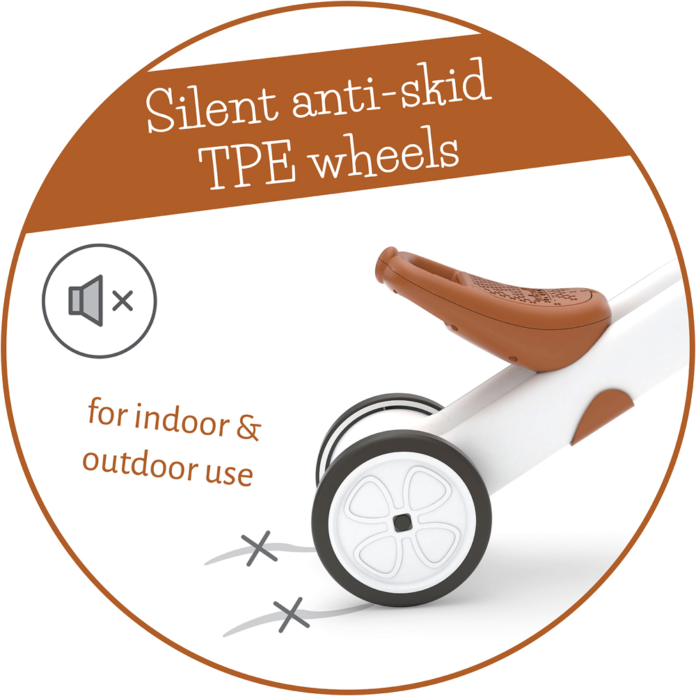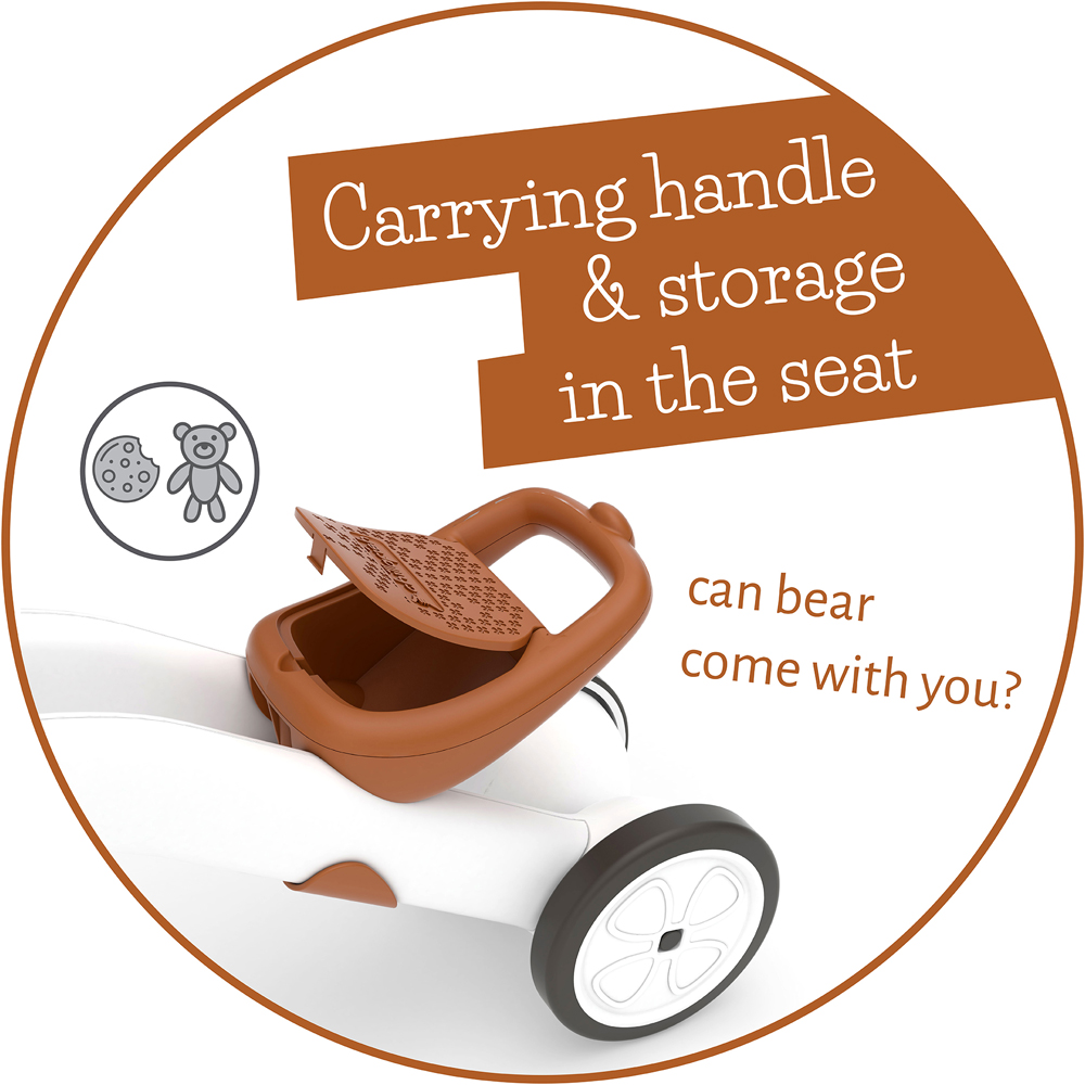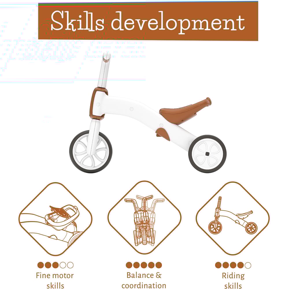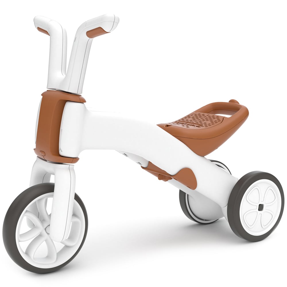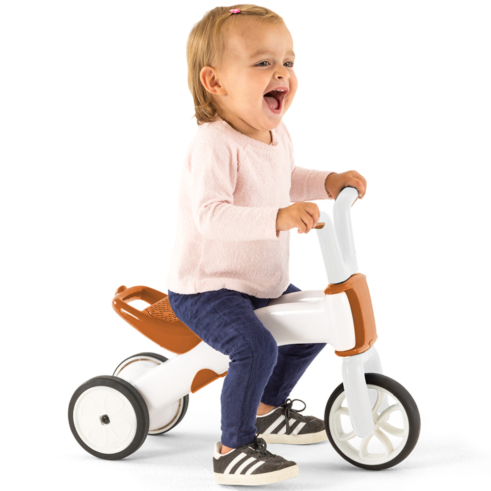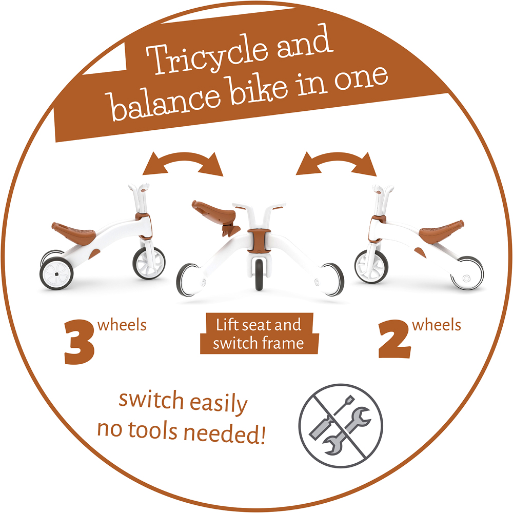 Chillafish Bunzi 2-in-1 gradual balance bike and tricycle is uniquely designed to help teach your child balance at his own pace in a fun way. Your child learns to balance step by step on 3 wheels and when it's ready, on 2 wheels. Made of high-quality ABS material, the frame can switch between a 3-wheel mode to a 2-wheel mode in just a few seconds; no tools required. The back wheels in 3-wheel mode still offer more stability, but are purposely close to each other, hence less stable than a traditional tricycle or 4-wheel ride-on, so your child feels in control of his own balance. The seat grows with your child (8,7 inch / 22 cm in 3-wheel mode to 10,2 inch / 26 cm in 2-wheel mode). Only in this way the new skills of your son or daughter can be better supported, just until he or she has mastered balance and is ready for a bigger balance bike like BMXie2 or Charlie. The silent anti-skid synthetic rubber tires are non-marking; so no worries when your toddler wants to ride inside the house. But the material of the tires is also strong enough to be used outside and to survive the wildest outdoor treks. Bunzi is made of a very lightweight high-quality ABS material (4,2 lbs / 1,8 kg), which makes it easy to carry around thanks to the handgrip built into the back of the seat. You can easily bring the Bunzi on all your child's trips and adventures. Your child can bring along a toy or snack for the ride in the hidden storage box. Your son or daughter will love it and it's at the same time also very useful to train the fine motor skills of your lovely toddler. With cute bunny-style handlebars, an intuitive form that grows with your child and vibrant colours to display the personality of your child, Bunzi is sure to become the preferred bike buddy for your kids; recommended for ages 1-3, maximum weight 55 lbs (25 kg). Bunzi is being sold worldwide for 7 years already and most parents have this little Bunzi in the family for many years, giving it to little sis or bro after the first use. You can’t lose the tool, as there are no tools needed, Bunzi arrives assembled in the packaging and the seat adjust without any tool.