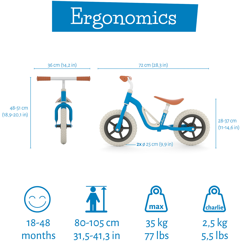 Chillafish Charlie is a hyper lightweight 10" balance trainer with puncture-proof tires and a high-quality metal frame weighing only 5,5 lbs / 2,5 kg. The perfect toy to train your toddler gross motor skills, balance and steering. The custom molded comfort seat and handlebar are easily adjustable in height. The seat is adjustable from 11-14,6 inch / 28-37 cm and the handlebar can adjust from 18,9-20,1 inch / 48-51 cm. Thanks to its lightweight frame your toddler can easily control the bike and, in combination with the integrated carry handle, it makes it easy us parents to carry it as well. The no-puncture 10-inch EVA tires are really comfortable: no need to inflate the tires anymore, no puncture risk, from now on only fun! Charlie comes in a myriad of stylish colours, from cool red up to stylish vintage variants as well. There’s a style for every child. Integrating high-quality design in a very lightweight and intuitive product at very sharp pricing, Charlie for sure is the best value for money balance bike you'll find. Years of fun and skills to train! Charlie balance bike will teach your kids to ride a real bicycle in no time! Recommended age: 18-48 months Recommended kids height: 31,5-41,3 inch / 80-105 cm