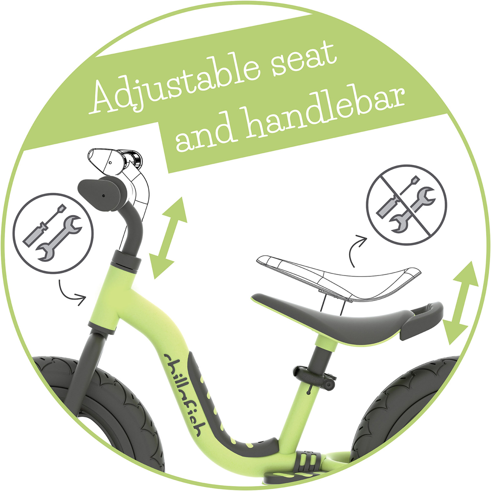 Chillafish Charlie Sport is a hyper lightweight 12" balance trainer with puncture-proof tires and a high-quality metal frame weighing only 6,6 lbs / 3 kg. The perfect toy to train your toddler gross motor skills, balance and steering. The custom molded comfort seat and handlebar are easily adjustable in height. The seat is adjustable from 12.6-15.7 inch / 32-40 cm and the handlebar can adjust from 19.5-20,9 inch / 49,5-53 cm. Thanks to its lightweight frame your toddler can easily control the bike and, in combination with the integrated carry handle at the seat, it makes it easy for parents to carry it as well. Charlie Sport comes with an integrated foot support and a handlebar foam for a real racing look! The no-puncture 12-inch Rubber Skin tires are really comfortable: no need to inflate the tires anymore, no puncture risk, from now on only fun! Integrating high-quality design in a very lightweight and intuitive product at very sharp pricing, Charlie Sport for sure is the best value for money balance bike you'll find. Years of fun and skills to train! Charlie Sport balance bike will teach your kids to ride a real bicycle in no time! Recommended age: 2-5 years Recommended kids height: 34.3-43.3 inch / 87-110 cm