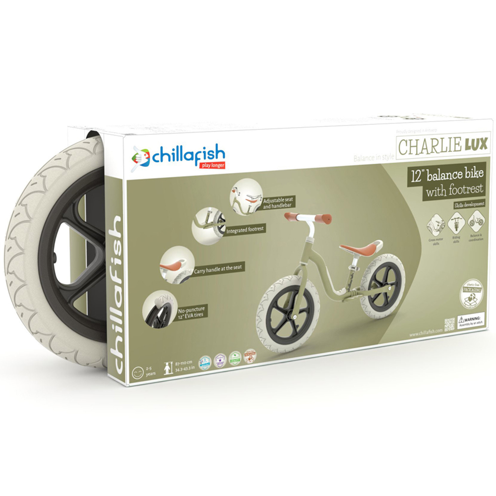 Chillafish Charlie Lux is a hyper lightweight 12" balance trainer with puncture-proof tires and a high-quality metal frame weighing only 6,6 lbs / 3 kg. The perfect toy to train your toddler gross motor skills, balance and steering. The custom molded comfort seat and handlebar are easily adjustable in height. The seat is adjustable from 12.6-15.7 inch / 32-40 cm and the handlebar can adjust from 19.5-20,9 inch / 49,5-53 cm. Thanks to its lightweight frame your toddler can easily control the bike and, in combination with the integrated carry handle at the seat, it makes it easy for parents to carry it as well. The no-puncture 12-inch EVA tires are really comfortable: no need to inflate the tires anymore, no puncture risk, from now on only fun! Integrating high-quality design in a very lightweight and intuitive product at very sharp pricing, Charlie Lux for sure is the best value for money balance bike you'll find. Years of fun and skills to train! Charlie Lux balance bike will teach your kids to ride a real bicycle in no time! Recommended age: 2-5 years Recommended kids height: 34.3-43.3 inch / 87-110 cm