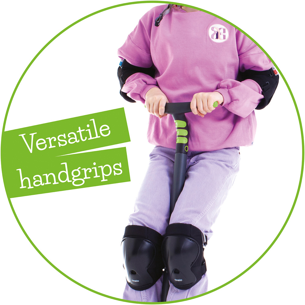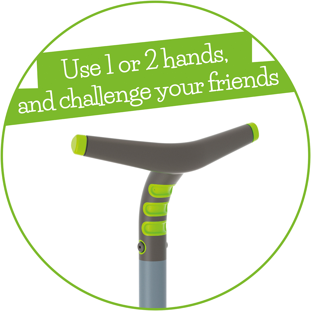 Chillafish Poogi is a pogo stick designed with fun extra challenges. Can you pogo with 1 hand? Or even with 1 foot. The higher you bounce, the more LED lights will glow! This fun pogo stick has a centralized extra foot pedal and an ergonomic handgrip. Practice balance by switching from two feet to one! And then try to let go of a hand too, step by step. The versatile soft-touch handgrip is designed for one or two hands. It's great for gross motor skills development and physical fitness.