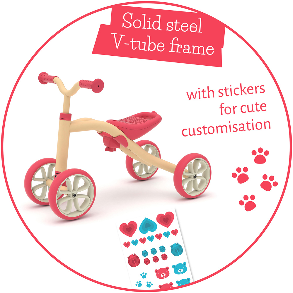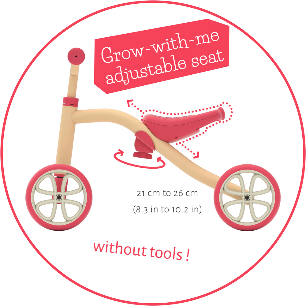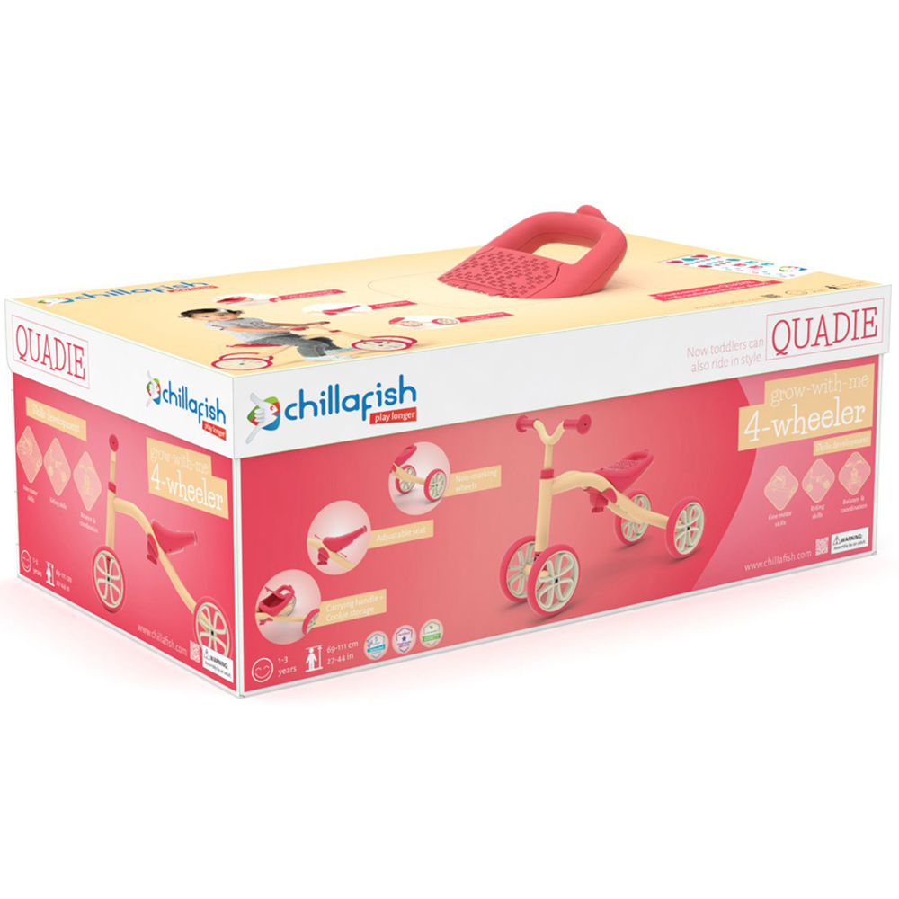 Chillafish Quadie takes the 4-wheeler back to its roots. This simple grow-with-me adjustable 4-wheel ride-on is the perfect buddy to grow up with and to explore the world in style. Thanks to the 4 wheels, Quadie is a very stable ride-on toy for learning the first rides. Your son or daughter learns to steer, to push-off, to move forward and backward and to explore the world in a safe and fun way. The seat grows with your child and can be easily adjusted in 3 positions without tools (21-23-25 cm). The seat not only adjusts to the child's height, there is also a small storage box in the seat to carry cookies or goodies. The carry handle makes it super easy for daddy or mommy to take along this lightweight ride-on toy. This evergreen ride-on toy has a very simple and stylish look, and comes with a sticker sheet to customize the 4-wheeler of your favourite little buddy. All the wheels are silent and non-marking TPE rubber, so no worries when your toddler wants to ride inside the house. But the tires are also strong enough for the first outdoor adventures. Now toddlers can also ride in style ;-) Recommended kids' height: between 27,6-39,4 inch / 70-100 cm, or kids from 1 to 3 years.