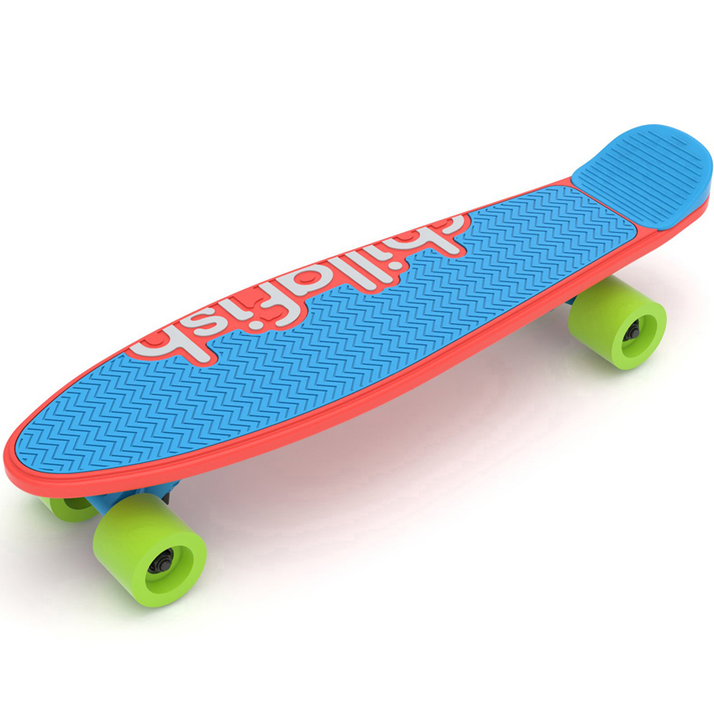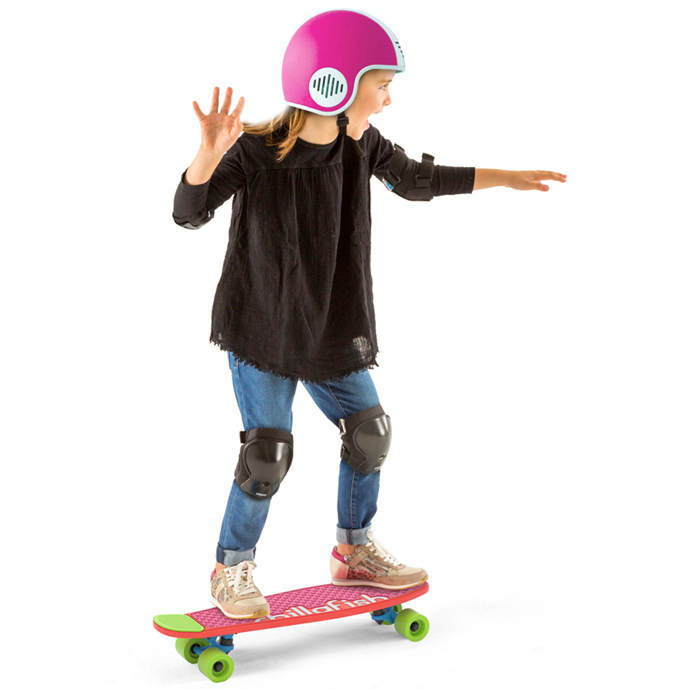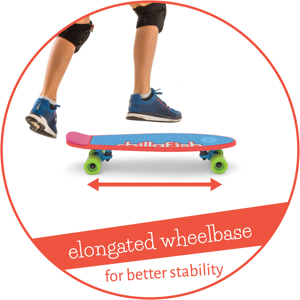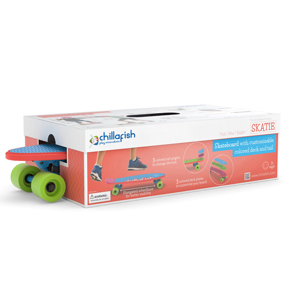 Chillafish Skatie is a customizable skateboard made for younger children from 3 years and up to… everyone else. Skatie has an elongated wheelbase for better control and stability when taking the first steps in learning how to skate. In addition to the long wheel base, Skatie has 3 different tail angles to customize the ride from easy to etchy. Each tail has a different colour and a different angle. How good are you in manoeuvring the board? How high can you jump? How quick can you turn? How many tricks do you know? These colourful tails help you flipping the board and lifting the trucks! Customise your Skatie further with the 3 included coloured decks; Looks like a new toy each time you change the colour – cool huh?! The ABEC-7 bearings with polyurethane wheels, ensure you glide through the park and smoothly roll over anything. But Skatie is really a full option customisable skateboard with 3 coloured deck plates and 3 coloured tail angles! Everyone can ride Skatie with the small, medium or large tail, it’s just a matter of preference. Create the perfect combination that fits you best. Pick, mix and skate!