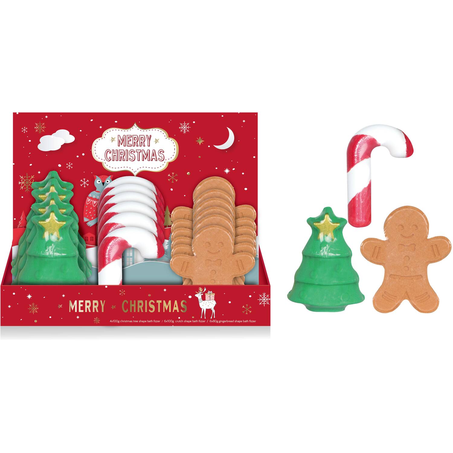 Transform your bath time with these Christmas Bath Bombs. Featuring delightful shapes like a Christmas tree, candy cane, and gingerbread man, each fizzer is infused with a warm vanilla scent. The vibrant colours and holiday-themed designs bring a joyful, soothing experience to your bath. It is perfect for adding a touch of Christmas cheer to your self-care routine.