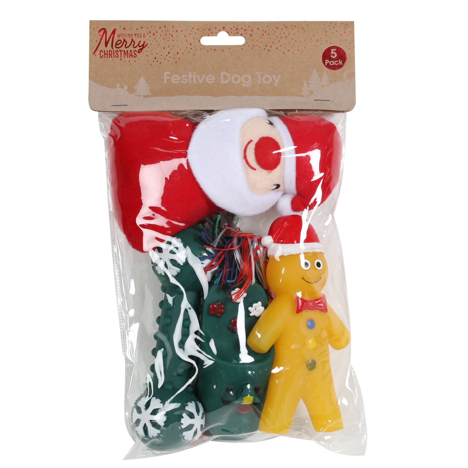 Spoil your pet this year with the perfect present for your pooch, this Christmas Dog Toy Pack. This pack contains an assortment of polyester and TPR dog toys shaped like festive themed characters such as Santa, gingerbread, reindeer, trees, and more that your canine friend is sure to enjoy getting their teeth into and playing with.