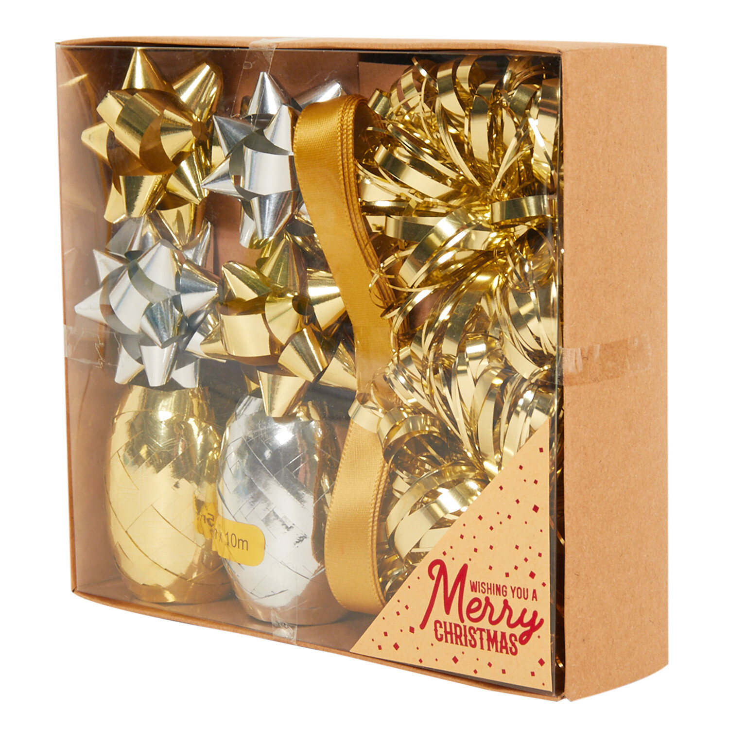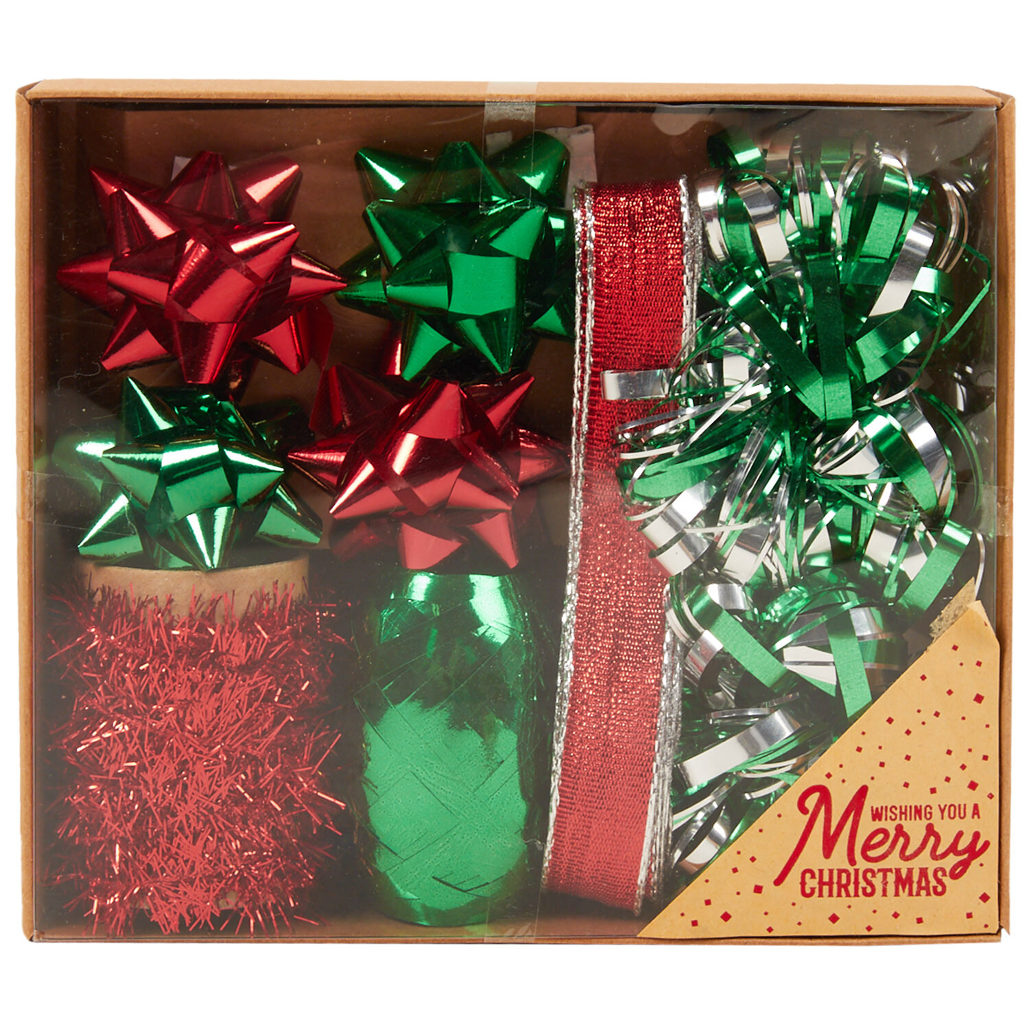 Elevate your holiday gifting with the Christmas Gift Accessory Set. Designed to add a special touch to your presents, this comprehensive pack includes everything you need to make your gifts stand out. It features four charming star embellishments, two beautiful flower bows, a ribbon egg for a unique flair, one glitter ribbon for a touch of sparkle, and an additional classic ribbon. Each item is crafted to enhance your wrapping experience and ensure your gifts are memorable. This set is available in an assortment of red and green or gold and silver colours.
