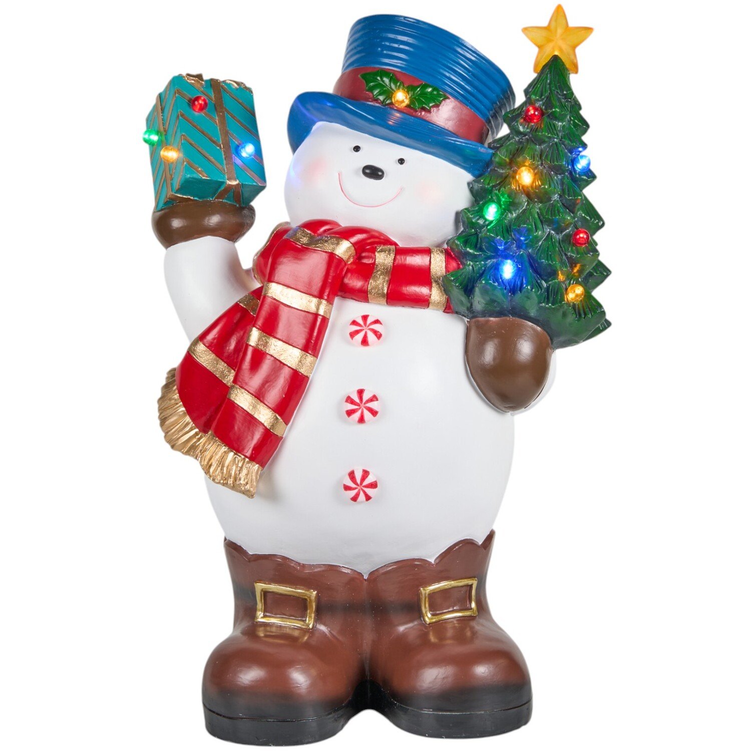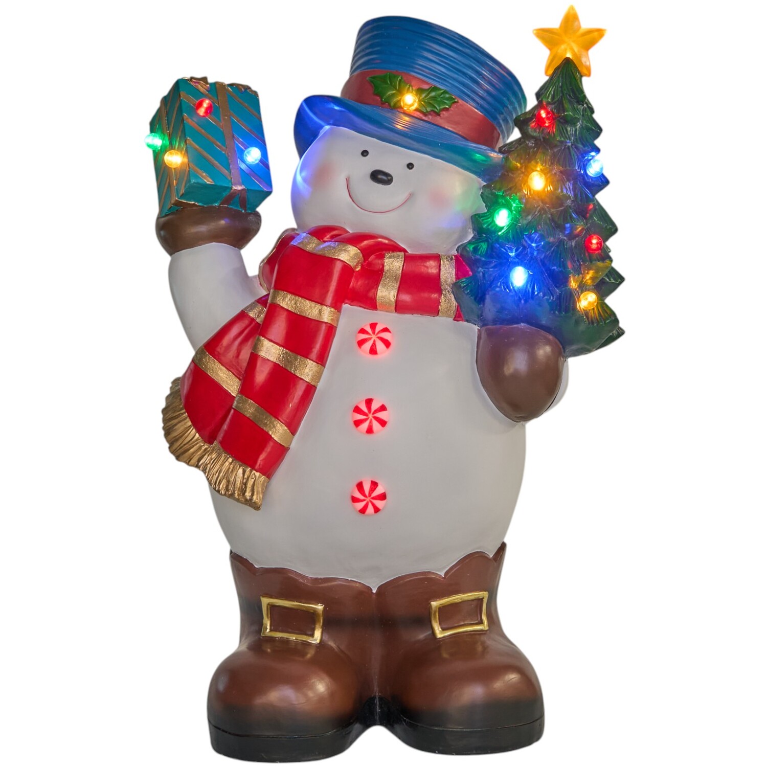 Brighten your holiday decor with the Christmas Snowman in Hat Ornament. Showcasing a cute snowman holding a Christmas tree in one hand and a present in the other, this ornament adds a touch of charm to your space. This snowman wears a bright blue hat and a contrasting red scarf to keep himself toasty. Adorned with multicoloured LED lights, this ornament casts a cheerful glow to instantly enhance the atmosphere in your home. Whether perched atop the table or countertop, this ornament is sure to bring a smile to all your guests' faces.