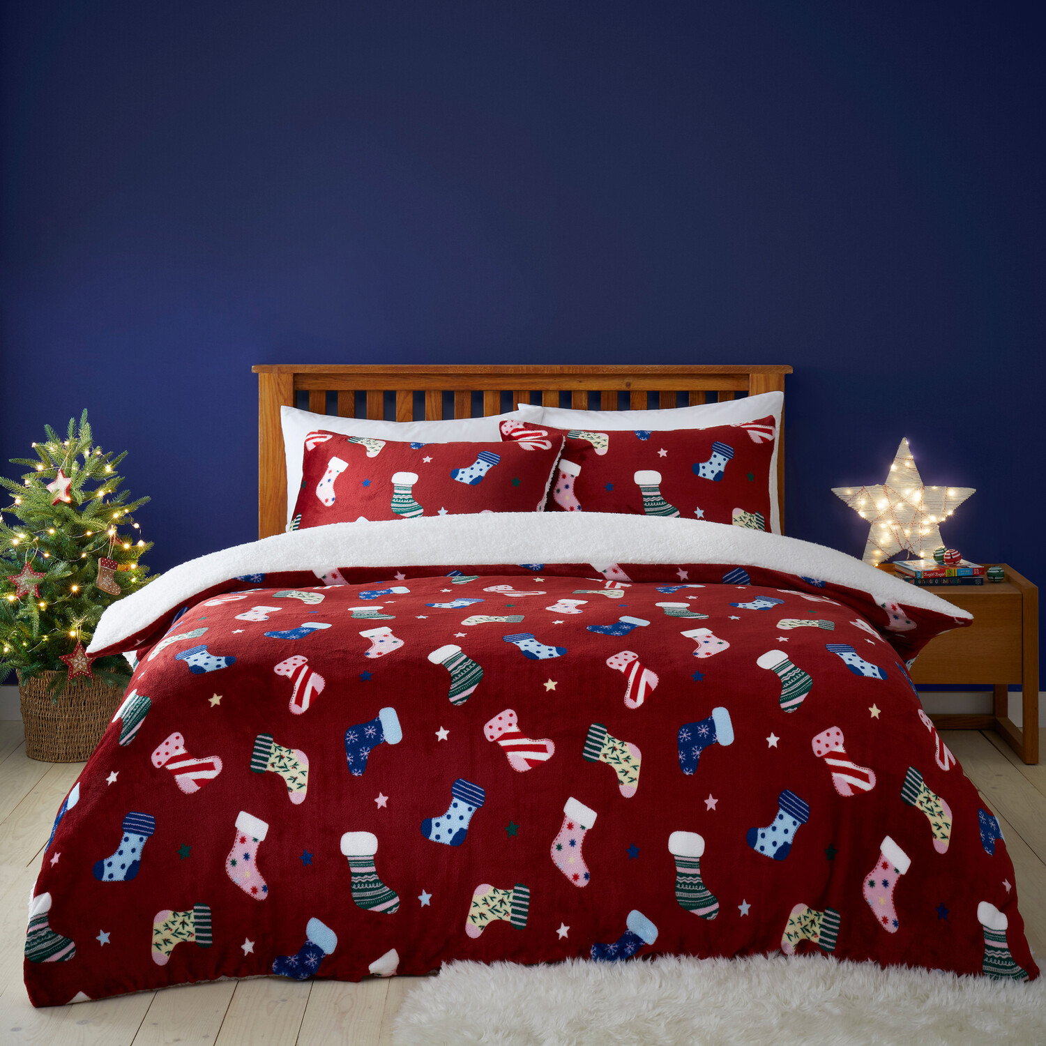Spruce up your festive decor with the Christmas Stockings Fleece Duvet Set. It features colourful stocking designs all over the deep red background, perfect for sprinkling some holiday cheer into your space. It's super soft to the touch to keep you warm and cosy on those cold winter nights, and machine washable to allow for easy cleaning.
