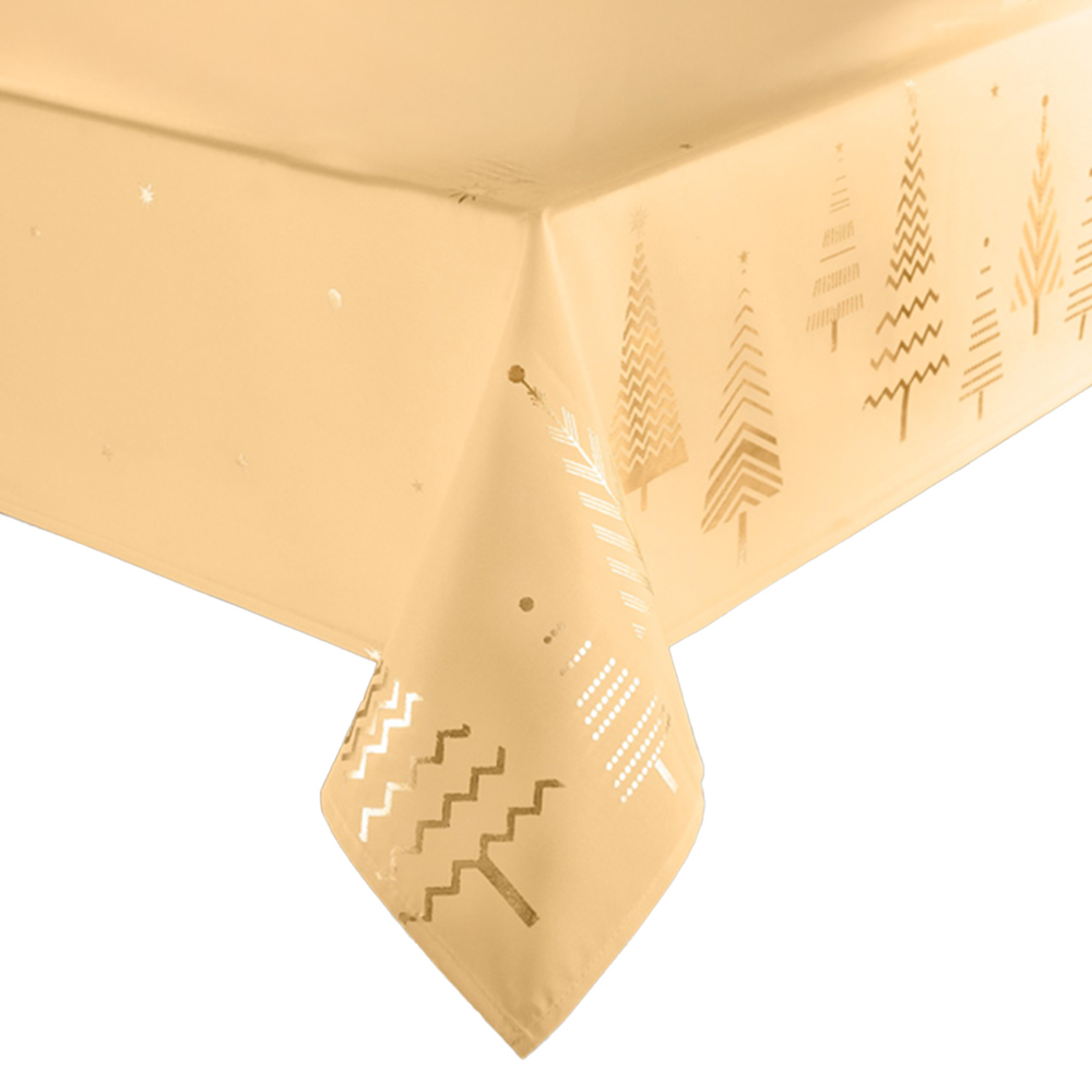Add festive glimmer to your dining table with the Christmas Story Cream and Gold Christmas Tree Tablecloth 228 x 132cm. This crisp cream tablecloth features a foil-style golden tree border along the fringe. Golden foil, including stars and snowflakes, is dotted across the cloth. This festive dining tablecloth is the perfect addition to your Christmas parties, adding a lively touch to the holiday season. It can be easily washed in the machine, making it a fresh new piece even after many dinner spills. The tablecloth measures 228 x 132cm, ideal for same-length tables.