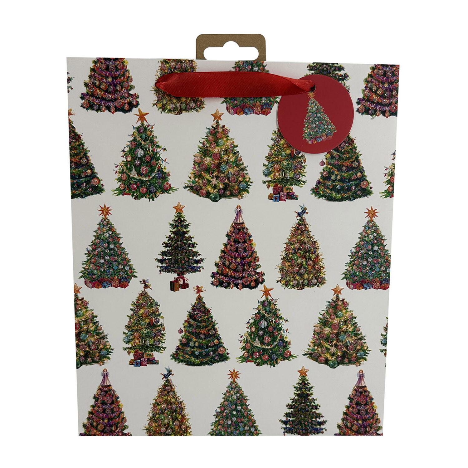 Elevate your gift-giving experience with the exquisite Christmas Tree Ribbon Gift Bag. This stunning gift bag features a luxurious matte laminated finish for a sophisticated touch. Adorned with a vibrant red satin ribbon, the bag showcases charming Christmas tree designs that add a unique flair to your holiday presents. Ideal for reusing, it even includes a coordinating tag for adding a personalised message to the lucky recipient.