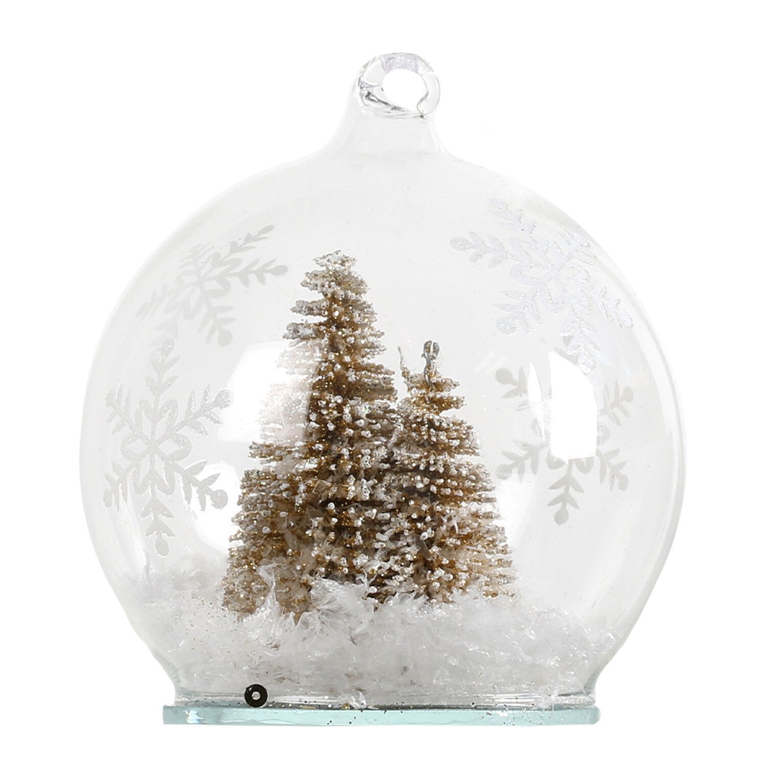This Christmas Tree Scene Bauble is a stylish and modern way to decorate for Christmas. The traditional clear bauble has been upgraded with two golden Christmas trees inside and a glitter snowflake design along the glass walls. Designed to make you feel warm and cosy, this bauble will look elegant hanging from your Christmas tree.