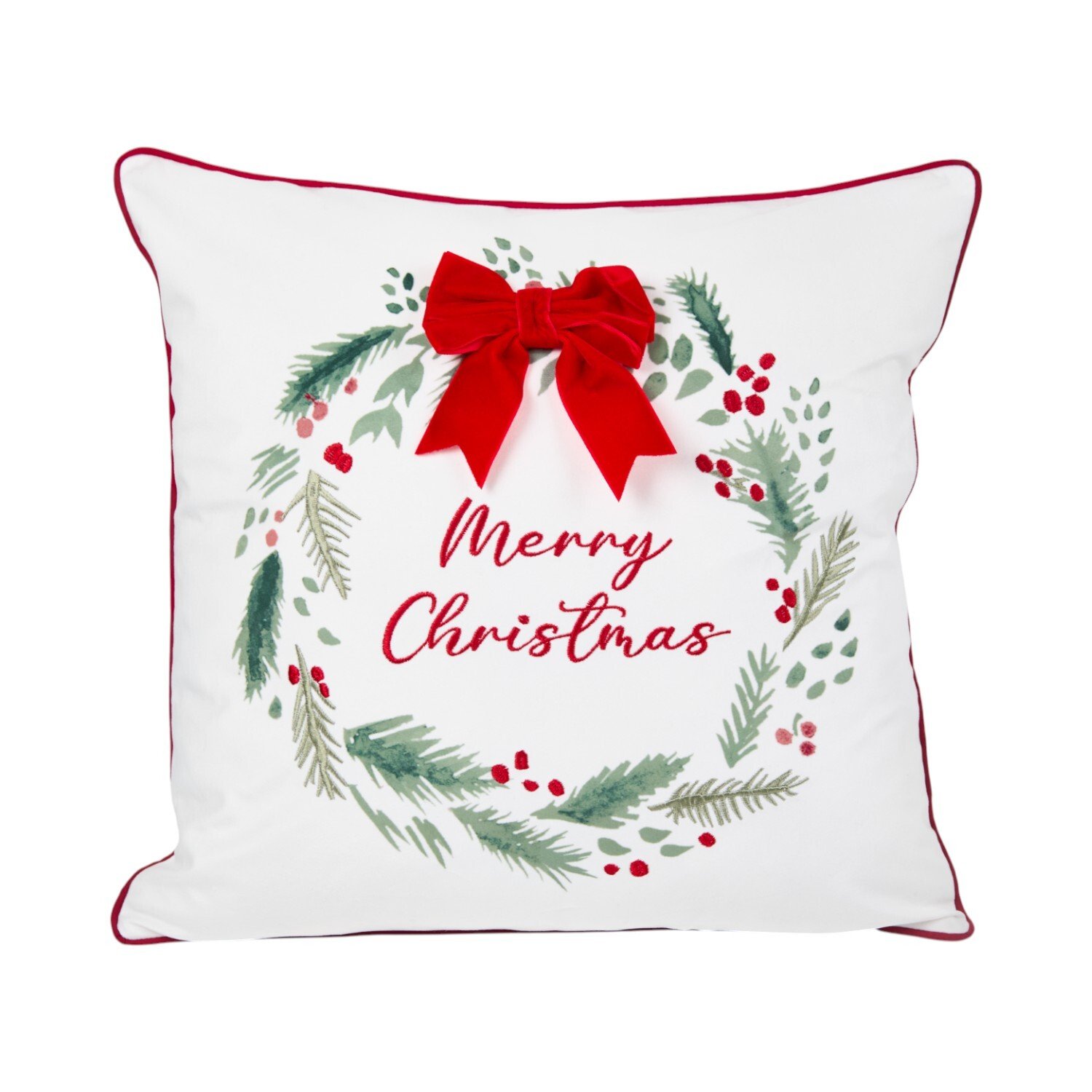 Elevate your holiday decor with the Christmas Wreath Square Cushion. This cushion flaunts an elegant wreath design with a red bow detail, adding a touch of festive charm to your decor. It offers a super soft and plush feel, making it perfect for adorning sofas, standalone chairs, and beds.