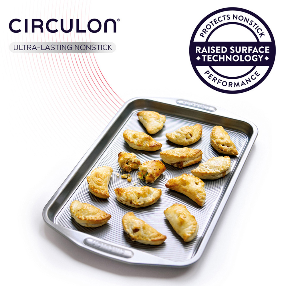 Bake with confidence with the Circulon Momentum Nonstick Steel Bakeware Set. The bakeware set is designed with the confident baker in mind, and each product comes with a unique total nonstick system. It creates easy food release, saves time and effort and delivers perfect baking performance time after time. All the nonstick surfaces are PFOA, cadmium and lead-free. The 0.6mm thickness of each piece also resists warping in the oven and will heat evenly, giving you confidence in the kitchen. This baking tray set is oven-safe up to 230°C and dishwasher-safe for complete convenience. It comes with the Circulon lifetime guarantee for your complete peace of mind. The set includes a 30cm square baking tray, a 9 x 13-inch rectangular cake tin, and a 9 x 5-inch loaf tin.