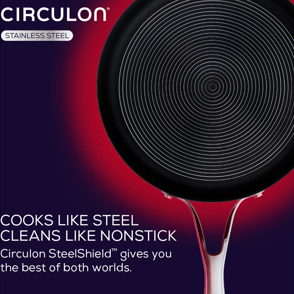 Experience the art of cooking with the Circulon Steel Shield S Series 22cm Nonstick Stainless Steel Frying Pan. Combining the beauty and durability of stainless steel with the ease and convenience of nonstick, this kitchen pan is the best of both worlds. The cookware features steel peaks to protect the nonstick grooves, so you never have to worry about scratching nonstick again. With an extra thick base, the cookware heats up quickly to reduce hot spots on any cooktop, including induction. Featuring a stylish brushed stainless steel exterior, it is dishwasher safe for easy cleanup and oven-safe to 260°C for cooking a wide range of recipes. Plus, the nonstick is completely metal utensil safe.