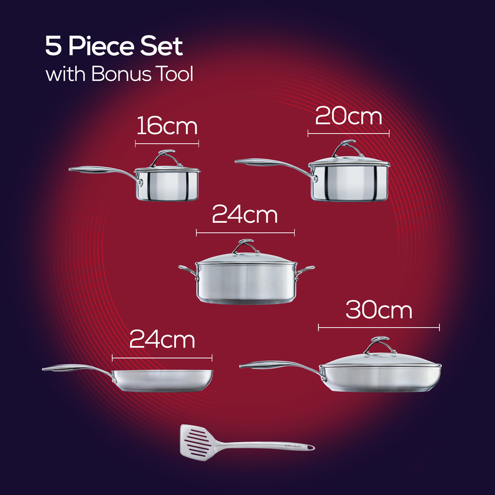 Experience the art of cooking with the Circulon Steel Shield S Series Nonstick Stainless Steel Cookware Set with Slotted Turner. Combining the beauty and durability of stainless steel with the ease and convenience of nonstick, this kitchen cookware set is the best of both worlds. The cookware set features steel peaks to protect the nonstick grooves, so you never have to worry about scratching nonstick again. With an extra thick base, the cookware heats up quickly to reduce hot spots on any cooktop, including induction. Featuring a stylish brushed stainless steel exterior, it is dishwasher safe for easy cleanup and oven-safe to 260°C for cooking a wide range of recipes. Plus, the nonstick is completely metal utensil safe. This set includes 16cm and 20cm saucepans, a 24cm stock pot, a 24cm frying pan, a 30cm saute pan and a slotted turner.