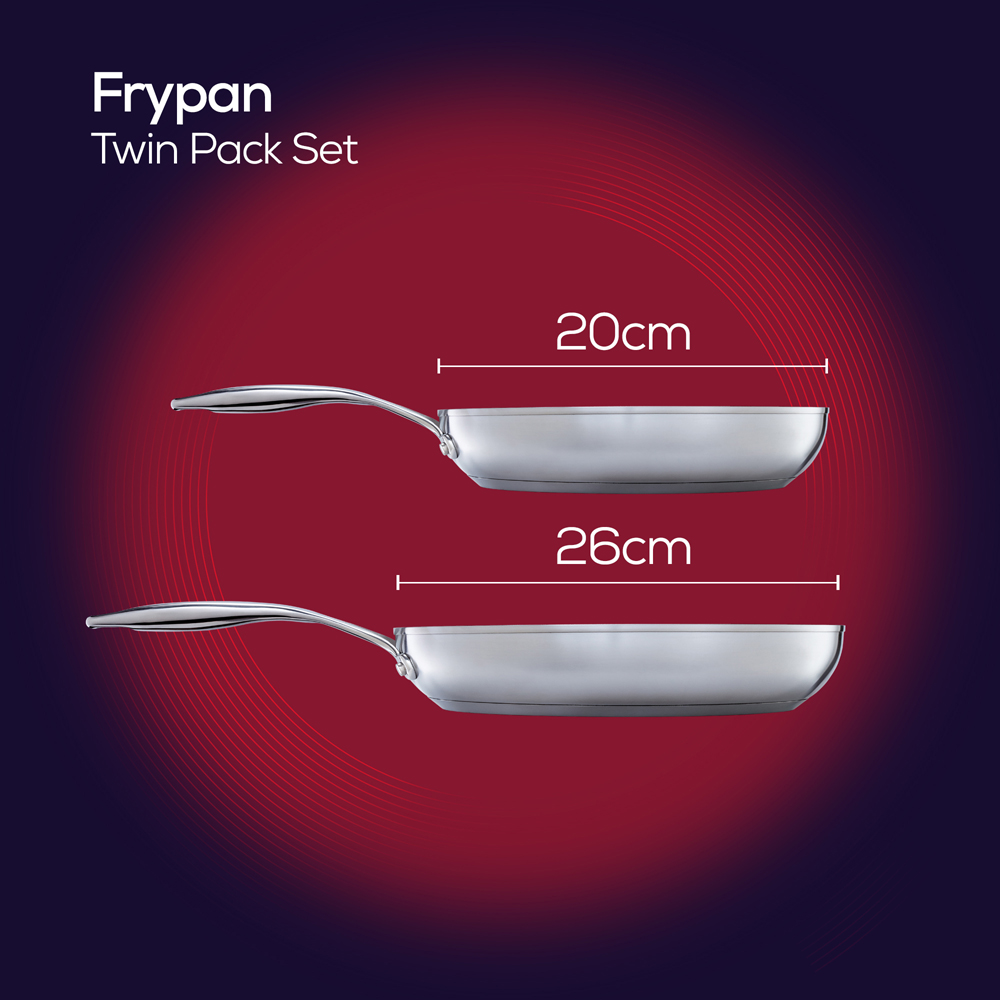 Experience the art of cooking with the Circulon Steel Shield S Series Nonstick Stainless Steel Frying Pan Set. Combining the beauty and durability of stainless steel with the ease and convenience of nonstick, this kitchen pan set is the best of both worlds. The cookware features steel peaks to protect the nonstick grooves, so you never have to worry about scratching nonstick again. With an extra thick base, the cookware heats up quickly to reduce hot spots on any cooktop, including induction. Featuring a stylish brushed stainless steel exterior, it is dishwasher safe for easy cleanup and oven-safe to 260°C for cooking a wide range of recipes. Plus, the nonstick is completely metal utensil safe. Set of two 20cm and 26cm frying pans.