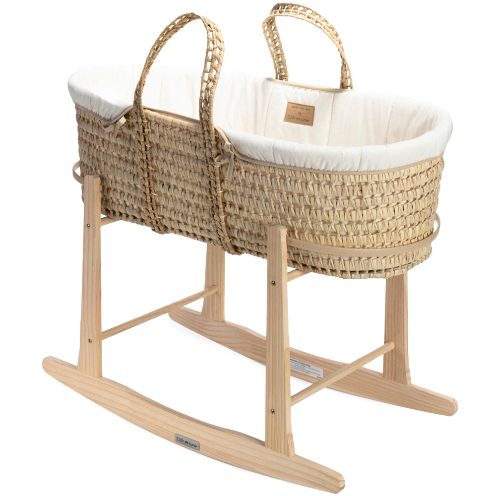 Introducing the Clair de Lune Organic Palm Moses Basket, designed with eco-conscious parents in mind. Crafted from sustainably sourced materials, this Moses basket brings together natural elegance and comfort for your newborn. Eco-Friendly and Sustainable Design – Handwoven from durable, natural palm leaf and dressed in 100% organic cotton, this Moses basket reduces environmental impact, giving parents a stylish, natural sleep solution that supports a greener planet. Premium Natural Bamboo Mattress – Equipped with a hypoallergenic bamboo mattress made from coir coconut fibre and wool, it provides optimal breathability, natural temperature regulation, and protection against allergens, creating a clean, comfortable sleeping space. GOTs Certified Organic Dressing – This stunning Organic range is crafted from hypoallergenic and breathable GOTs-certified Cotton which means it is better for the skin, helping ensure your baby’s comfort and sleep. It has also been tested for OEKO-TEX Standard 100. Complete with Essentials – Each basket includes a super-soft cream Moses basket sheet, removable organic dressing, a natural rocking stand, and a firm bamboo mattress, giving you everything you need for your baby’s first sleeping space in one bundle. Sustainably Made in the UK – This Moses basket showcases the finest organic materials with a commitment to quality and sustainability. Suitable from birth up to 9 kg (or until your baby can roll over, pull up, or sit unaided), the Clair de Lune Organic Palm Moses Basket offers comfort, style, and peace of mind for eco-conscious families. Do not carry the Moses basket while your baby is inside.