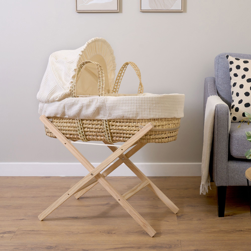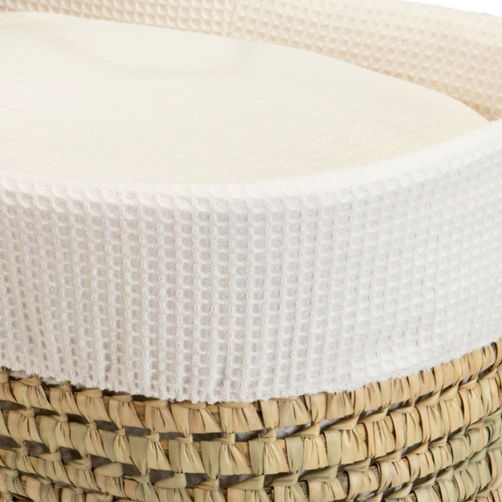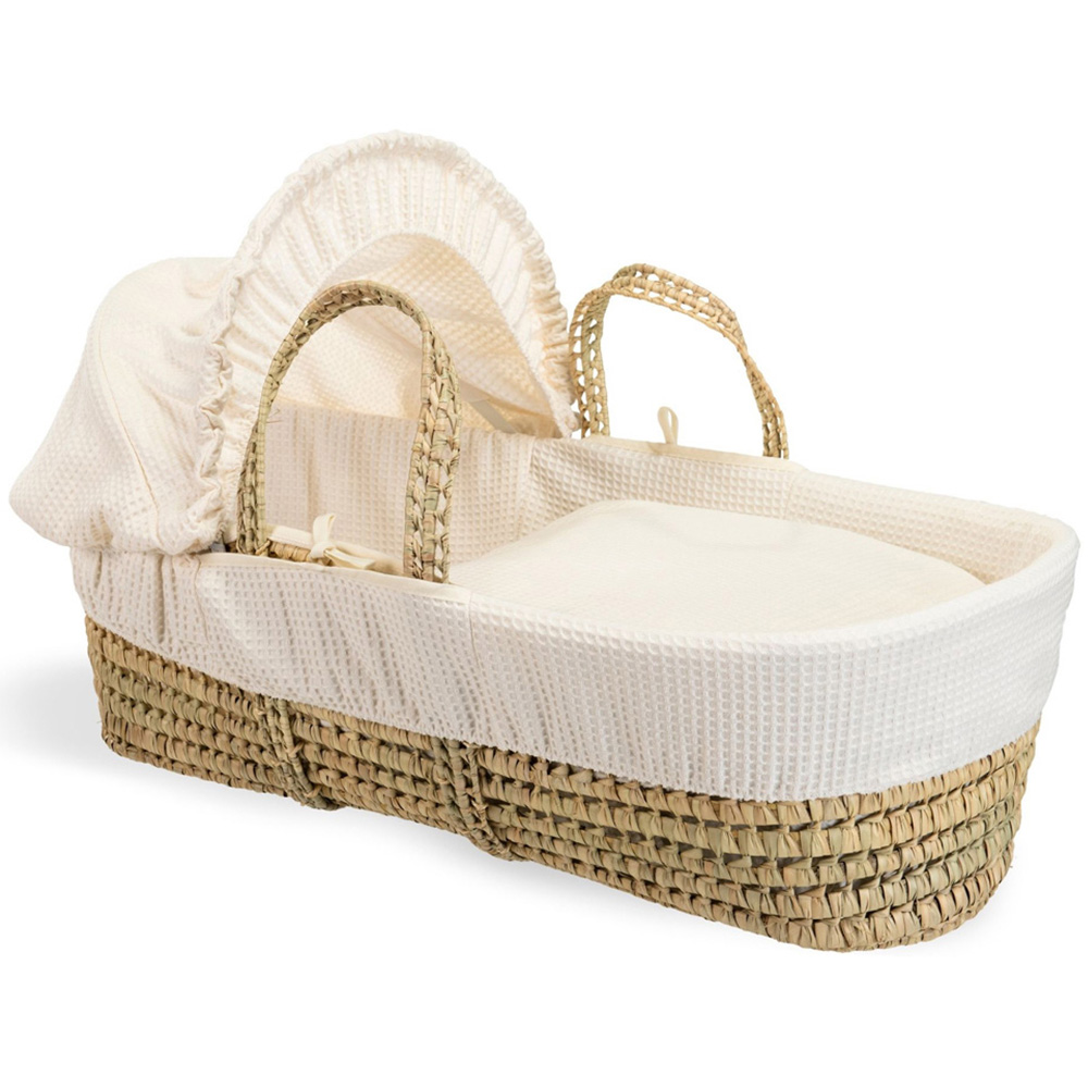 Nestle your newborn in the timeless beauty of the Clair De Lune Cream Waffle Palm Moses Basket with Folding Stand. Crafted with love and care, this traditional masterpiece offers the perfect sanctuary for your little one's peaceful sleep. The Moses basket is a testament to traditional craftsmanship. Each one is handwoven from organic natural palm leaf, ensuring sturdiness, durability, and a touch of rustic charm. Complete with a removable, adjustable hood, coverlet, and a hypoallergenic fibre mattress, and natural folding stand, our Moses basket has everything you need for your baby's comfort and convenience. Your baby's delicate skin deserves the best. The super-soft waffle cotton fabrics create a snug, breathable sleeping space that's gentle and cosy. The included mattress boasts hypoallergenic fibres for ultimate comfort. Its breathable design regulates temperature, while the Oeko-Tex 100 certified soft-touch, water-resistant cover is removable and washable for easy maintenance. Our commitment to the environment shines through our ethically, environmentally, and sustainably sourced organic palm baskets. They meet the stringent BS EN 1466:2014 standards for added peace of mind. Suitable from birth to a maximum weight of 9 kg (or until baby begins to roll over, pull themselves up or sit unaided). Do not carry baby in the Moses Basket.