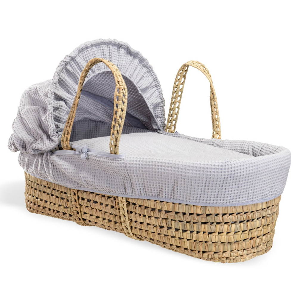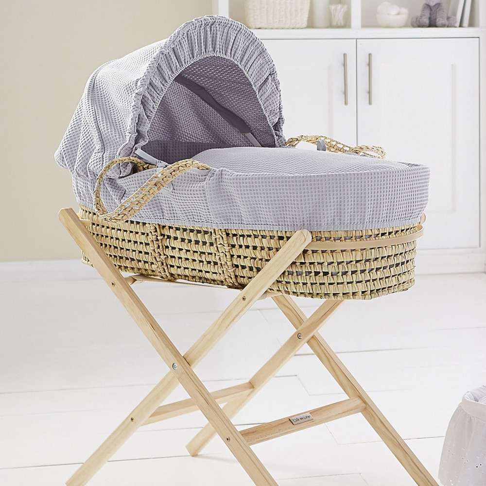 Nestle your newborn in the timeless beauty of the Clair De Lune Grey Waffle Palm Moses Basket with Folding Stand. Crafted with love and care, this traditional masterpiece offers the perfect sanctuary for your little one's peaceful sleep. The Moses basket is a testament to traditional craftsmanship. Each one is handwoven from organic natural palm leaf, ensuring sturdiness, durability, and a touch of rustic charm. Complete with a removable, adjustable hood, coverlet, and a hypoallergenic fibre mattress, and natural folding stand, our Moses basket has everything you need for your baby's comfort and convenience. Your baby's delicate skin deserves the best. The super-soft waffle cotton fabrics create a snug, breathable sleeping space that's gentle and cosy. The included mattress boasts hypoallergenic fibres for ultimate comfort. Its breathable design regulates temperature, while the Oeko-Tex 100 certified soft-touch, water-resistant cover is removable and washable for easy maintenance. Our commitment to the environment shines through our ethically, environmentally, and sustainably sourced organic palm baskets. They meet the stringent BS EN 1466:2014 standards for added peace of mind. Suitable from birth to a maximum weight of 9 kg (or until baby begins to roll over, pull themselves up or sit unaided). Do not carry baby in the Moses Basket.