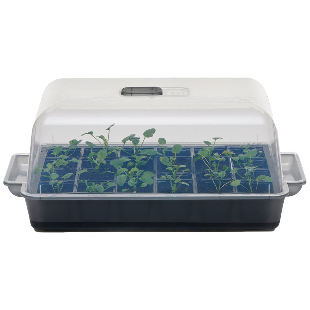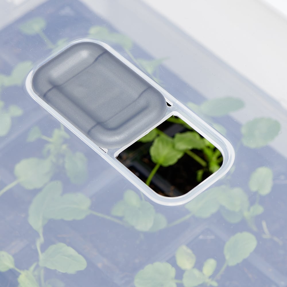 The Clever Pots Easy Water Propagator Lid works with the Clever Pots Propagator Base (sold separately) to create the ideal environment for growing seeds into healthy seedlings and offers a simple way to water and maintain young plants. The clear lid has handles that are designed to allow water to flow through, directly into the base of the propagator underneath the seedlings without removing the lid, encouraging healthy root growth and preventing trapping of fragile stems between the lid and base. The handle inlets work with the roof vent to improve air circulation. It is made from flexible PP plastic, reducing the risk of cracking and frost damage, designed to be used across multiple seasons. Dimensions: D 44.6 x W 25.2 x H 14.1cm. Material: PP - Polypropylene.