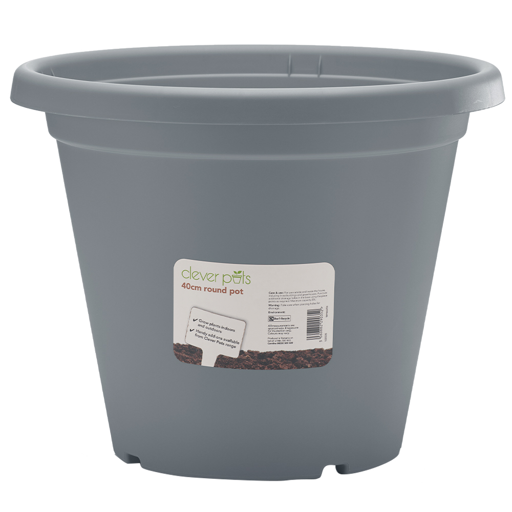 The Clever Pots 40cm Round Plant Pot is ideal for growing large plants. It is designed to be used with our range of accessories, so you can make the most of your growing space. This grey-coloured lightweight, durable pot is reusable year-on-year and recyclable at the end of its life. It is made from 30% recycled Polypropylene plastic, weather-resistant, UV colour stable and ideal for outdoor use. The pot has a handy wide rim designed so that the pot is easily moved. The rim also discourages pests such as slugs and snails from crawling up and into the pot. The small feet promote airflow around the base of the pot and roots. For additional drainage the pierce points in the base of the pot can be punctured as required. This 40cm pot is available in grey and terracotta colours and each pot can also be used together with intuitively designed accessories including plant pot wheels for easy movement, plant pot feet and cane support for stability and custom-fit reservoirs which mean plants remain watered for longer. Note: Take care while piercing holes for drainage. Dimensions: D 40.3 x W 40.3 x H 32cm. Dia: 40.1cm. Weight: 0.575kg.