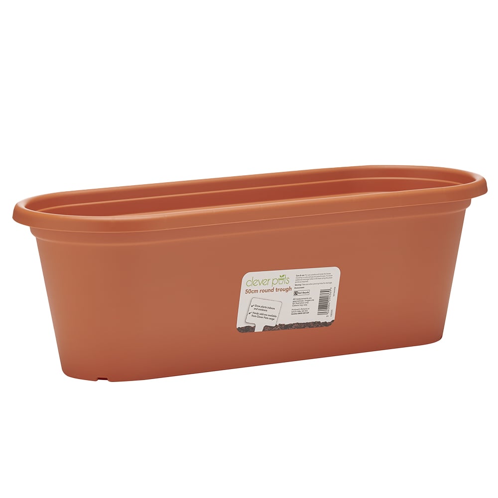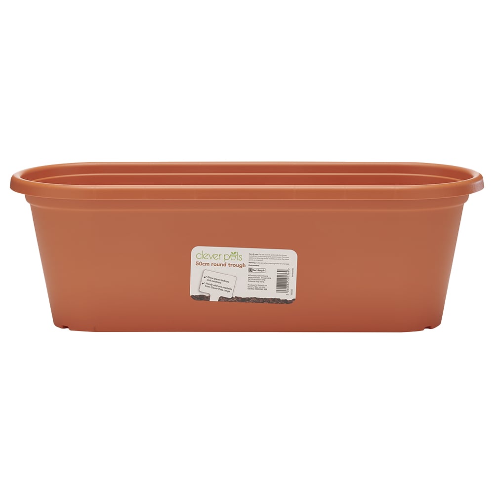 Made from durable Polypropylene plastic, the Clever Pots 50cm Terracotta Long Trough Pot (8L) is perfect for growing plants indoors and outdoors, including outbuildings and greenhouses. It's designed to be used with our range of accessories so you can make the most of your growing space. The trough has a handy wide rim designed so it can be easily moved. The rim also discourages pests such as slugs and snails from crawling up and into the trough. The small feet promote airflow around the base of the pot and roots. For additional drainage the pierce points in the base of the pot can be punctured as required. This 50cm trough is available in Grey and Terracotta colours. Made from 30% recycled plastic, weather resistant, UV colour stable and ideal for outdoor use these troughs can be used season after season and can be recycled at the end of its life. The troughs can also be used together with intuitively designed accessories. Note: Take care while piercing holes for drainage. Dimensions: D 19.3 x W 50 x H 16.2cm. Weight: 0.165.